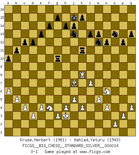 Last move : 0-1 2020 February 24 3:51:32 [Event "FICGS__BIG_CHESS__STANDARD_SILVER__000014"] [Site "FICGS"] [Date "2019.08.10"] [Round "1"] [White "Kruse,Herbert"] [Black "Aahlad,Yeturu"] [Result "0-1"] [WhiteElo "1981"] [BlackElo "1943"] 1.j2-k4 h15-g13 2.m2-m4 j15-k13 3.h1-o7 m15-m13 4.l1-p5 k16-h15 5.e2-e4 h16-p9 6.p1-o3 l16-p12 7.f1-b5 g16-j15 8.b1-c3 e15-e13 9.g1-j2 b16-c14 10.p5-n7 p9-m9 11.o7-o6 p16-o14 12.n2-n3 f16-b12 13.o1-j6 m9-k11 14.j6-p12 o14-p12 15.o6-o15 p12-o14 16.o15-n14 o14-n12 17.n14-p12 m16-m14 18.p12-h5 d15-d14 19.d2-d3 k11-p11 20.n7-p5 p11-f2 21.e1-e2 f2-f10 22.c1-o12 m14-n14 23.a1-f1 f10-o10 24.o12-l9 n12-m10 25.h5-m9 c16-l8 26.m9-m10 o10-m10 27.l9-m10 l8-e2 28.c3-e2 n14-n10 29.m10-l9 n15-n13 30.m1-m3 o16-d6 31.m3-l3 q16-o16 32.l3-l6 b12-f8 33.q1-m1 o16-o10 34.m1-m3 e16-e14 35.f1-f6 n10-d10 36.l9-h6 f8-h6 37.f6-h6 d6-f8 38.h6-b6 d10-b10 39.p5-m8 b10-b6 40.l6-b6 o10-p10 41.p2-p3 c14-a13 42.h2-f3 p10-p8 43.m8-k10 p8-o8 44.n3-n4 j15-l14 45.b6-j6 h15-j13 46.m3-l3 g13-h11 47.k10-p5 e14-g14 48.j1-h1 j16-j15 49.p5-o4 a16-o16 50.k1-m2 o16-o12 51.l3-l5 a13-c12 52.l5-p5 p15-p14 53.j6-q6 o12-o15 54.p5-q5 q15-q13 55.q6-p6 l14-n15 56.q5-f5 f15-f14 57.b5-f9 d14-d13 58.p6-a6 a15-a13 59.o3-p5 o15-o9 60.f9-k5 o9-o12 61.p5-n6 o8-p8 62.a6-a8 p8-p6 63.k5-n8 p6-n6 64.n8-g14 f8-k4 65.j2-k4 j13-g14 66.f5-g5 j15-h15 67.a8-g8 h11-j13 68.g5-g6 n6-n10 69.g8-g10 n10-g10 70.g6-d6 c15-c14 71.m2-k3 g14-h12 72.h1-h2 j13-k11 73.k3-l5 k11-l9 74.e2-f4 b15-b13 75.a2-a4 a13-a12 76.b2-b3 a12-a11 77.q2-q4 h12-j10 78.h3-h4 g10-c10 79.c2-c4 b13-b12 80.g2-g3 a11-a10 81.b3-b4 d13-d12 82.a4-a5 b12-b11 83.b4-b5 c14-c13 84.a5-a6 c12-e11 85.o4-n3 c13-c12 86.m4-m5 j10-h8 87.f3-g5 l9-k7 88.k4-j6 h8-j6 89.g5-j6 k7-l5 90.j6-l5 c10-k10 91.k2-k4 k13-m12 92.l2-l4 o12-o9 93.h2-h3 m12-o11 94.d6-g6 n13-n12 95.l5-n6 o9-p9 96.l4-l5 p14-p13 97.l5-l6 n15-o13 98.g6-g8 p13-p12 99.n3-p5 k10-g10 100.g8-k8 h15-j15 101.p5-n3 l15-l13 102.n3-l5 p9-o9 103.n6-m8 o9-o3 104.l5-n3 e11-g12 105.m8-n6 o3-o7 106.l6-l7 o11-m12 107.j3-j4 g12-j13 108.j4-j5 o7-o11 109.n3-j7 o11-k11 0-1 Follow this game move after move (download)Nonsense was the last thing Fischer was interested in, as far as Chess was concerned. (Elie Agur) Oft bringt ein stiller Zug das Erdbeben. (Richard Reti) Botvinnik trató de alejar el misterio referente al Ajedrez, siempre relacionandolo a situaciones de la vida diaria. Solía llamar al Ajedrez un problema inexacto típico, similar a aquellos en que la gente tiene siempre que resolver a cada día. (Garry Kasparov) C'est la seule position que je connaisse où les deux camps sont mals. Propos prêtés à V. Anand. Statistics can be made to prove anything - even the truth. (Author unknown)