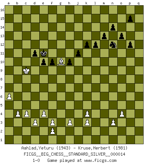Last move : 1-0 2020 March 9 18:45:13 [Event "FICGS__BIG_CHESS__STANDARD_SILVER__000014"] [Site "FICGS"] [Date "2019.08.10"] [Round "2"] [White "Aahlad,Yeturu"] [Black "Kruse,Herbert"] [Result "1-0"] [WhiteElo "1943"] [BlackElo "1981"] 1.j2-k4 p16-o14 2.h1-o7 h15-g13 3.m2-m4 j15-k13 4.e2-e4 h16-m12 5.h2-g4 b16-c14 6.f1-b5 g16-j15 7.b1-c3 e15-e13 8.p1-o3 f16-b12 9.l1-p5 k16-h15 10.d2-d3 m15-m13 11.k1-h2 l16-p12 12.m1-m3 d15-d14 13.c1-l9 p12-m9 14.o7-o9 c16-l8 15.l9-k10 m12-g12 16.e1-e3 n15-n14 17.e3-f3 o16-f8 18.g1-j2 e16-e14 19.o3-n5 e14-f14 20.m3-p3 m9-n10 21.o9-p9 n10-p12 22.n2-n3 m16-m14 23.o1-h7 m14-l14 24.q1-m1 f8-l13 25.p9-b9 f14-f3 26.g2-f3 l13-f8 27.a1-g1 g12-f13 28.b9-f13 l8-f13 29.g4-f6 f15-f14 30.g1-g8 f13-j10 31.g8-p8 q15-q13 32.m1-m3 f8-k4 33.j2-k4 b12-k4 34.j3-k4 l14-l2 35.m3-m1 l2-o2 36.p5-o4 j10-f7 37.m1-n1 o2-l2 38.h7-l4 l2-m2 39.k2-k3 f7-l12 40.p8-h8 l12-n10 41.f6-g4 n10-k7 42.m4-m5 k7-m5 43.n5-o3 m5-o3 44.p2-o3 m2-q2 45.p3-p12 q13-p12 46.o4-q2 q16-q2 47.c3-d5 k15-k14 48.h8-b8 c14-a13 49.k10-o6 j16-k15 50.b8-q8 a16-q16 51.q8-q16 q2-q16 52.j1-j2 o14-n12 53.h2-j4 l15-l13 54.a2-a4 q16-q2 55.j2-j3 b15-b14 56.o3-o4 a13-b11 57.b2-b4 a15-a13 58.a4-a5 k13-l11 59.c2-c4 j15-k13 60.b5-g10 b11-d12 61.n1-q1 q2-q1 62.g10-q1 o15-o13 63.d5-e7 g13-f11 64.e7-d9 h15-g13 65.d9-e11 b14-b13 66.j4-h6 k15-j15 67.g4-f6 c15-c14 68.h6-g8 d14-d13 69.g8-f10 h14-h13 70.f6-e8 j14-j13 71.q1-g10 j13-j12 72.e8-c9 e13-e12 73.c9-e10 d12-e10 74.l4-e10 g15-g14 75.g10-h9 l13-l12 76.o6-k10 j12-j11 77.k10-g7 a13-a12 78.g7-b12 j15-h14 79.e11-c10 k13-h12 80.f10-g8 k14-k13 81.g8-e9 f11-e9 82.b12-e9 h12-f11 83.e9-c11 f11-e13 84.c10-b12 g13-f15 85.b12-a14 g14-g13 86.h9-e6 f14-f13 87.e6-c8 g13-g12 88.a14-c13 f13-f12 89.j3-j4 f12-f11 90.e10-f9 h13-h12 91.j4-j5 h12-h11 92.j5-h6 h14-h13 93.h6-g7 h13-h12 94.g7-f8 g12-g11 95.f8-e9 g11-g10 96.f9-e8 h12-g11 97.c11-d12 e13-g12 98.c13-d15 l11-j10 99.d15-f14 g12-f14 100.d12-f14 k13-k12 101.f14-d12 g11-g12 102.e9-d10 j10-g11 103.d10-c10 g11-f13 104.d12-a15 f15-e13 105.c10-c11 e13-d11 106.c8-b9 d13-d12 107.c11-d10 d11-f10 108.e8-c10 e12-e11 109.d10-e9 d12-d11 110.c10-d11 f10-d11 111.b9-d11 g12-f12 112.a15-b16 f12-g12 113.d11-e12 f13-d12 114.b16-e13 f11-f10 115.e9-d9 e11-e10 116.d9-c8 d12-f11 117.e13-c11 c14-c13 118.e12-c14 f11-d12 119.c11-d12 c13-d12 120.c14-b13 g12-f11 121.b13-a12 n12-l11 122.a12-d15 h11-h10 123.d15-h11 l11-n12 124.c8-c9 f11-e11 125.h11-g10 d12-d11 126.a5-a6 1-0 Follow this game move after move (download)Place the contents of the Chess box in a hat, shake them up vigorously, pour them on the board from a height of two feet, and you get the style of Steinitz. (H. E. Bird) Wenn du nicht weißt was du tun sollst, warte bis dein Gegner eine Idee hat. Sie wird sicher schlecht sein. (Siegbert Tarrasch) El Ajedrez es parte de una cultura y si una cultura esta en decadencia, entonces también el Ajedrez declinará. (Mikhail Botvinnik) La tactique, c'est ce que vous faites quand il y a quelque chose à faire; la stratégie, c'est ce que vous faites quand il n'y a rien à faire. (Savielli Tartacower) Chess, like love, like music, has the power to make people happy. (Siegbert Tarrasch)