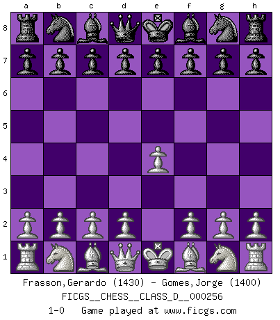Last move : 1-0 2019 September 21 23:17:46 [Event "FICGS__CHESS__CLASS_D__000256"] [Site "FICGS"] [Date "2019.08.11"] [Round "1"] [White "Frasson,Gerardo"] [Black "Gomes,Jorge"] [Result "1-0"] [WhiteElo "1430"] [BlackElo "1400"] 1.e4 1-0 This chess game has been lost on time (started : 2019.08.11 5:50:29) King's pawn Opening Player White won this chess game. Follow this game move after move (download)Fischer wanted to give the Russians a taste of their own medicine. (Larry Evans) Konzentriere dich auf materielle Gewinne. Nimm, was dir dein Gegner gibt, ausser es gibt einen guten Grund der dagegenspricht. (Robert James Fischer) Estaba muy claro de que el punto vulnerable del Gran Maestro Americano (Bobby Fischer) radicaba en las posiciones de doble filo, colgantes, irracionales, donde el siempre falló en encontrar un triunfo aún en una posición de clara victoria. (Efim Geller) Pour se monter efficace, un Cavalier a besoin d'avant-postes ! Les Cavaliers font les meilleurs bloqueurs de pions passés. Lottery : A tax on people who are bad at math. (Author unknown)