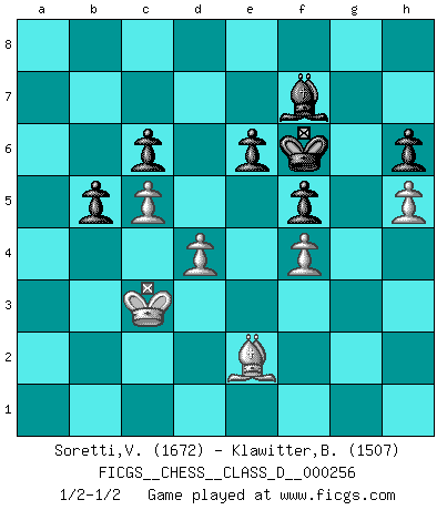 Last move : 1/2-1/2 2019 September 21 7:52:23 [Event "FICGS__CHESS__CLASS_D__000256"] [Site "FICGS"] [Date "2019.08.11"] [Round "1"] [White "Soretti,Vincenzo"] [Black "Klawitter,Bernd"] [Result "1/2-1/2"] [WhiteElo "1672"] [BlackElo "1507"] 1.Nf3 Nf6 2.d4 d5 3.c4 c6 4.Nc3 e6 5.e3 dxc4 6.Bxc4 b5 7.Bd3 a6 8.O-O Bb7 9.Ne4 Nbd7 10.Qc2 Rc8 11.Nc5 Bxc5 12.dxc5 O-O 13.b4 h6 14.Bb2 Qe7 15.Rad1 a5 16.a3 axb4 17.axb4 Ra8 18.Ra1 Rfd8 19.Rfd1 Nf8 20.Rxa8 Rxa8 21.Ra1 Rxa1+ 22.Bxa1 N8d7 23.Qc3 Qe8 24.Ne5 Nd5 25.Qd4 N7f6 26.g3 Qa8 27.Bc3 Nxc3 28.Qxc3 Nd5 29.Qd4 Nxb4 30.Qxb4 Qa1+ 31.Kg2 Qxe5 32.Qd4 Qxd4 33.exd4 Kf8 34.Kf3 Ke7 35.Ke3 f5 36.f4 g5 37.Kd2 gxf4 38.gxf4 Bc8 39.h4 Bd7 40.Be2 Be8 41.Kc3 Kf6 42.h5 Bf7 1/2-1/2 Reti Opening Kingside Castling by player White (move 8) Kingside Castling by player Black (move 12) This chess game ended in a draw. Follow this game move after move (download)Good positions don't win games, good moves do. (Gerald Abrahams) Modernes Schach erfordert enorme Anspannung. Es ist für einen normalen Menschen unmöglich das auszuhalten. (Viktor Kortschnoi) Un sacrificio se refuta mucho mejor al aceptarlo. (Wilhelm Steinitz) Toute estimation doit être constamment réévaluée. (Jacob Estrin) There is far too much law for those who can afford it and far too little for those who cannot. (Derek Bok)