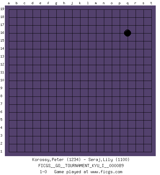Last move : 1-0 2019 September 10 18:13:29 [Event "FICGS__GO__TOURNAMENT_KYU_I__000089"] [Site "FICGS"] [Date "2019.08.11"] [Round "1"] [Black "Korossy,Peter"] [White "Seraj,Lily"] [Result "1-0"] [Rating 1 "1234"] [Rating 2 "1100"] 1.q16 1-0 This go game has been lost on time (started : 2019.08.11 12:42:25) Here are the names of the openings (joseki) played in the four corners : Player Black won this Go (weiqi, baduk) game. Follow this game move after move (download)Dead group ? Always win ko fights ! (Anonymous) Pretend inferiority and encourage his arrogance. (Sun Tzu)