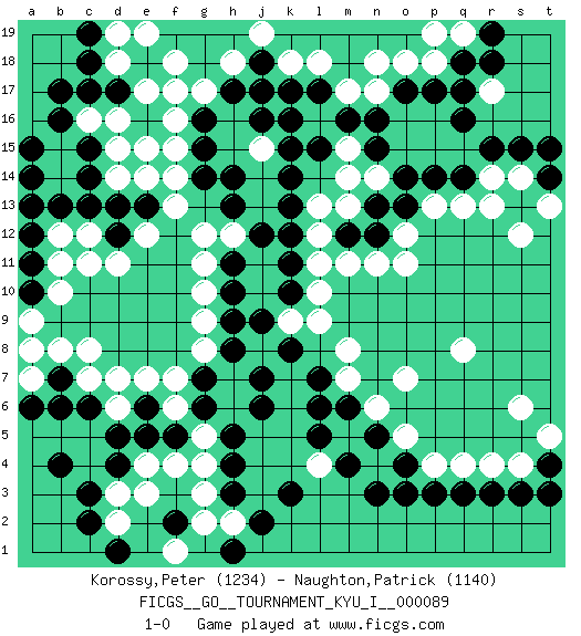Last move : 1-0 2019 October 26 13:16:9 [Event "FICGS__GO__TOURNAMENT_KYU_I__000089"] [Site "FICGS"] [Date "2019.08.11"] [Round "1"] [Black "Korossy,Peter"] [White "Naughton,Patrick"] [Result "1-0"] [Rating 1 "1234"] [Rating 2 "1140"] 1.q16 d16 2.d4 q4 3.o3 l4 4.r3 r4 5.q3 p4 6.n3 q8 7.k16 r14 8.q14 r13 9.r15 q13 10.p14 g17 11.c17 c16 12.d17 e17 13.e18 f18 14.e16 f17 15.b16 b15 16.b17 d18 17.c18 e19 18.c15 d15 19.c14 b14 20.c13 e15 21.b13 c8 22.c6 c11 23.b7 b8 24.a10 b10 25.a11 a9 26.a12 c7 27.b6 e7 28.h4 n17 29.l17 m15 30.k14 l13 31.k13 l12 32.k12 l11 33.k11 j15 34.k15 h12 35.h11 g11 36.h10 g10 37.h9 g9 38.h13 g12 39.h14 j17 40.g15 f15 41.j16 p13 42.o14 n14 43.o13 o12 44.n13 m13 45.n12 o11 46.p17 l9 47.h8 n11 48.n5 g4 49.h5 g5 50.h3 g3 51.l6 h6 52.j6 h7 53.j7 g8 54.k8 o7 55.n15 m14 56.n16 d3 57.c3 e3 58.c2 d2 59.s3 s4 60.t4 t5 61.t3 s6 62.e13 m17 63.m16 l18 64.k17 k18 65.h17 h18 66.j18 j19 67.j17 h2 68.j2 g2 69.k3 n4 70.o4 m5 71.m6 o5 72.m4 n6 73.l5 m7 74.g16 f16 75.e5 e12 76.d12 d11 77.g6 f6 78.g7 f7 79.f5 e4 80.d5 f4 81.f2 r17 82.s15 p18 83.q18 o18 84.q17 q19 85.r19 p19 86.r18 s14 87.t14 t13 88.t15 s12 89.o17 n18 90.l7 m8 91.p3 f13 92.c19 d19 93.k10 l10 94.j12 k9 95.j9 b12 96.a15 b11 97.a13 d14 98.d13 e14 99.d1 f1 100.h1 d6 101.b4 a7 102.a6 a8 103.m12 m11 104.e6 d7 105.g14 f14 106.l15 c12 107.a14 pass 108.pass 1-0 Here are the names of the openings (joseki) played in the four corners : Corner q4 : q4 o3 Hoshi (Hwajeom, Seongjeom, Xingwei`) 4-4 Point. The star or hoshi (4-4) point, emphasizing influence at the potential expense of territory. Ikken Kakari (Hankan Keolch'im, Yi Gua`jiao~, 1-Space Low Approach). Black 2 is the standard approach move to the 4-4. Corner q16 : q16 r14 Hoshi (Hwajeom, Seongjeom, Xingwei`) 4-4 Point. The star or hoshi (4-4) point, emphasizing influence at the potential expense of territory. Ikken Kakari (Hankan Keolch'im, Yi Gua`jiao~, 1-Space Low Approach). White 2 is the standard approach move to the 4-4. Corner d4 : d4 c8 Hoshi (Hwajeom, Seongjeom, Xingwei`) 4-4 Point. The star or hoshi (4-4) point, emphasizing influence at the potential expense of territory. Player Black won this Go (weiqi, baduk) game. Follow this game move after move (download)Knight's moves win running battles. (Anonymous) Follow your passion, and success will follow you. (Arthur Buddhold)