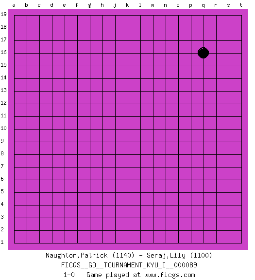 Last move : 1-0 2019 September 10 18:13:29 [Event "FICGS__GO__TOURNAMENT_KYU_I__000089"] [Site "FICGS"] [Date "2019.08.11"] [Round "1"] [Black "Naughton,Patrick"] [White "Seraj,Lily"] [Result "1-0"] [Rating 1 "1140"] [Rating 2 "1100"] 1.q16 1-0 This go game has been lost on time (started : 2019.08.11 12:42:25) Here are the names of the openings (joseki) played in the four corners : Player Black won this Go (weiqi, baduk) game. Follow this game move after move (download)Keshi is worth as much as an invasion ! (Anonymous) All the troubles of the world come from being unable to sit alone in a quiet room. (Blaise Pascal)