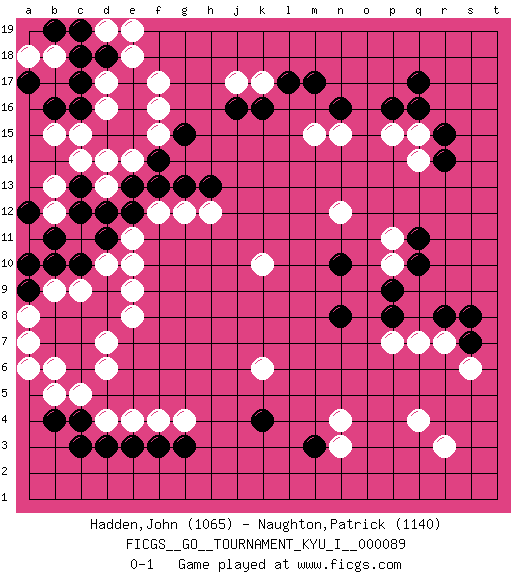 Last move : 0-1 2019 November 14 0:52:36 [Event "FICGS__GO__TOURNAMENT_KYU_I__000089"] [Site "FICGS"] [Date "2019.08.11"] [Round "1"] [Black "Hadden,John"] [White "Naughton,Patrick"] [Result "0-1"] [Rating 1 "1065"] [Rating 2 "1140"] 1.c4 q4 2.q17 d16 3.q10 r7 4.r8 q7 5.k4 n3 6.m3 n4 7.c16 c15 8.c17 d17 9.d18 e18 10.c18 f17 11.c10 k17 12.m17 q15 13.r15 q14 14.r14 n15 15.n16 m15 16.p16 p15 17.q16 e4 18.e3 f4 19.f3 g4 20.g3 d4 21.d3 c5 22.c3 b5 23.b4 d6 24.c7 d7 25.c8 b15 26.b16 d14 27.c13 b12 28.c12 b13 29.b11 a8 30.d11 e10 31.d9 e9 32.b8 a7 33.a9 b6 34.c6 e11 35.b7 a6 36.a10 k6 37.n10 k10 38.p8 r3 39.s7 s6 40.s8 b9 41.e12 d13 42.d8 e8 43.d12 f12 44.e13 e14 45.f13 d10 46.a12 c9 47.b10 c14 48.f14 f15 49.h13 g12 50.g13 h12 51.g15 f16 52.k16 j17 53.l17 a18 54.a17 b18 55.b19 d19 56.c19 e19 57.j16 p11 58.q11 p10 59.p9 p7 60.n8 n12 0-1 Here are the names of the openings (joseki) played in the four corners : Corner d16 : d16 c16 Hoshi (Hwajeom, Seongjeom, Xingwei`) 4-4 Point. The star or hoshi (4-4) point, emphasizing influence at the potential expense of territory. Corner d4 : c4 e4 Komoku (Somok, Xiao~mu`) 3-4 Point. The komoku (3-4) point is the traditional corner enclosure move.. Ikken Takagakari (Hankan Nop'dakeolch'im, Yi Gaogua`jiao~, 1-Space High Approach). The 5-4 approach move has become more popular in modern times, as modern Go emphasizes speed and influence. Player White won this Go (weiqi, baduk) game. Follow this game move after move (download)Five groups might live but the six will die. (Anonymous) Life is like internet, nothing interesting, but noone want to leave it. (Ilmars Cirulis)