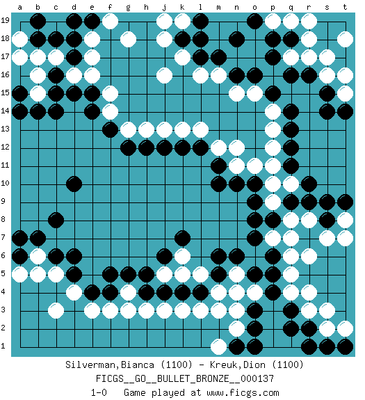 Last move : 1-0 2019 August 17 4:22:59 [Event "FICGS__GO__BULLET_BRONZE__000137"] [Site "FICGS"] [Date "2019.08.17"] [Round "1"] [Black "Silverman,Bianca"] [White "Kreuk,Dion"] [Result "1-0"] [Rating 1 "1100"] [Rating 2 "1100"] 1.q16 q4 2.c16 d4 3.c6 f3 4.d10 c5 5.d6 b6 6.b7 b5 7.c8 e17 8.d17 e16 9.c14 j16 10.o3 m3 11.o5 q6 12.l4 l3 13.k4 k3 14.j4 j3 15.h4 h3 16.o7 q8 17.r10 q10 18.q11 p10 19.r9 r8 20.q9 p9 21.p8 p7 22.o8 p11 23.q12 p12 24.q13 p13 25.q14 p14 26.p15 o15 27.o16 n15 28.n16 m16 29.m17 l16 30.l17 k17 31.n10 n11 32.m11 n12 33.m10 m12 34.l12 l13 35.k12 k13 36.j12 j13 37.h12 h13 38.g12 g13 39.f13 f14 40.e14 f15 41.s8 s7 42.s9 r6 43.q2 r3 44.r2 s2 45.q3 r4 46.s1 s3 47.f5 g4 48.g5 m4 49.m5 n4 50.p4 n5 51.n6 l5 52.m6 k5 53.j6 j5 54.h5 k6 55.k7 n2 56.o2 o4 57.p6 q7 58.k18 j18 59.l18 k19 60.l19 j19 61.n18 r17 62.r16 q17 63.p17 s16 64.s15 s17 65.q18 r18 66.p18 t15 67.t14 t16 68.s14 t18 69.d18 e18 70.f4 g3 71.e4 e3 72.e19 f19 73.d19 g18 74.d5 c3 75.o10 o11 76.o9 t8 77.t9 t7 78.n1 m1 79.o1 n3 80.e15 d16 81.d15 c17 82.c18 b17 83.b18 b16 84.c15 b15 85.b14 a18 86.b19 a17 87.a15 q5 88.p5 q19 89.a6 a5 90.a7 t2 91.r1 p19 92.o19 r19 93.t1 pass 94.a14 1-0 Here are the names of the openings (joseki) played in the four corners : Corner d4 : d4 c6 Hoshi (Hwajeom, Seongjeom, Xingwei`) 4-4 Point. The star or hoshi (4-4) point, emphasizing influence at the potential expense of territory. Ikken Kakari (Hankan Keolch'im, Yi Gua`jiao~, 1-Space Low Approach). Black 2 is the standard approach move to the 4-4. Corner d16 : c16 e17 Komoku (Somok, Xiao~mu`) 3-4 Point. The komoku (3-4) point is the traditional corner enclosure move.. Ikken Kakari (Hankan Keolch'im, Yi Gua`jiao~, 1-Space Low Pincer). The small knight move is the basic approach move to the 3-4 point stone. It has been continually used for over four centuries. There are limitless variations, with new moves constantly being discovered. White 2 opens the door to a treaure store of joseki. Corner q4 : q4 o3 Hoshi (Hwajeom, Seongjeom, Xingwei`) 4-4 Point. The star or hoshi (4-4) point, emphasizing influence at the potential expense of territory. Ikken Kakari (Hankan Keolch'im, Yi Gua`jiao~, 1-Space Low Approach). Black 2 is the standard approach move to the 4-4. Player Black won this Go (weiqi, baduk) game. Follow this game move after move (download)Everything happens on a grid-engraved board with black and white pieces, but if that's all you see then you don't know Go. (Pierre Audouard) Creativity is allowing yourself to make mistakes. Art is knowing which ones to keep. (Scott Adams)