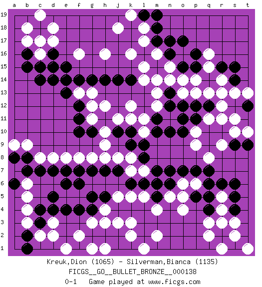 Last move : 0-1 2019 August 17 9:3:17 [Event "FICGS__GO__BULLET_BRONZE__000138"] [Site "FICGS"] [Date "2019.08.17"] [Round "1"] [Black "Kreuk,Dion"] [White "Silverman,Bianca"] [Result "0-1"] [Rating 1 "1065"] [Rating 2 "1135"] 1.q4 q16 2.d16 d3 3.d5 d8 4.c3 c2 5.c4 g3 6.b2 d2 7.c7 c8 8.d7 e8 9.e7 f8 10.f7 g8 11.g7 h8 12.h7 j8 13.j7 k8 14.l8 j3 15.j2 k2 16.h2 k3 17.c14 c15 18.d14 f16 19.f14 h16 20.h14 k16 21.k14 m16 22.o17 m14 23.m18 l18 24.m17 l17 25.r15 m12 26.r6 r5 27.q6 o4 28.r10 r12 29.q12 q13 30.p12 p13 31.o12 o13 32.n13 n14 33.n12 m13 34.m11 l11 35.m10 k12 36.r3 q3 37.s5 r4 38.s4 s3 39.r2 s2 40.s1 q2 41.c17 d17 42.b15 c16 43.b16 b17 44.c18 b18 45.m6 o6 46.o7 p6 47.p7 r11 48.q10 q11 49.p11 r14 50.s14 s13 51.q14 r13 52.s15 s10 53.s9 t10 54.t9 s11 55.t12 t13 56.b1 b3 57.b7 b6 58.b8 h12 59.f12 g13 60.g14 f13 61.e13 g12 62.f11 g11 63.g10 h10 64.f10 l10 65.l9 l7 66.m7 l5 67.m5 m4 68.l6 k5 69.k1 l1 70.j1 m2 71.a6 b5 72.e4 e5 73.g5 f5 74.f4 h4 75.g4 h3 76.g2 n5 77.h5 j5 78.l19 k19 79.m19 j18 80.j10 j11 81.k10 k11 82.n16 n15 83.o15 o14 84.p15 p14 85.n6 q15 86.p5 o5 87.o10 p10 88.s6 p9 89.n10 r1 90.n7 k7 91.k6 d18 92.d15 c19 93.d4 t1 94.n17 c16 95.c15 c17 96.q5 r3 97.j14 r9 98.q9 q8 99.q7 b4 100.e15 f2 101.f1 e1 102.k9 g1 103.e14 h9 104.f6 h1 105.e6 l15 106.p16 b9 107.a8 a9 108.o11 l14 0-1 Here are the names of the openings (joseki) played in the four corners : Corner d4 : d3 d5 Komoku (Somok, Xiao~mu`) 3-4 Point. The komoku (3-4) point is the traditional corner enclosure move.. Ikken Takagakari (Hankan Nop'dakeolch'im, Yi Gaogua`jiao~, 1-Space High Approach). The 5-4 approach move has become more popular in modern times, as modern Go emphasizes speed and influence. Player White won this Go (weiqi, baduk) game. Follow this game move after move (download)Dead group ? Always win ko fights ! (Anonymous) Nobody is always a winner, and anybody who says he is, is either a liar or doesn't play poker. (Amarillo Slim)