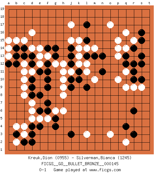 Last move : 0-1 2019 August 18 23:8:1 [Event "FICGS__GO__BULLET_BRONZE__000145"] [Site "FICGS"] [Date "2019.08.18"] [Round "1"] [Black "Kreuk,Dion"] [White "Silverman,Bianca"] [Result "0-1"] [Rating 1 "0955"] [Rating 2 "1245"] 1.q4 d16 2.d3 q16 3.r10 o3 4.r6 q2 5.r3 l3 6.r14 o17 7.s16 q14 8.q13 p13 9.q15 p14 10.q12 r15 11.s15 p15 12.s13 d5 13.g4 c3 14.d2 c4 15.j3 c10 16.f6 d7 17.c2 b2 18.b3 b4 19.d4 e5 20.e4 f5 21.g5 g6 22.f7 h6 23.e8 h8 24.f9 h10 25.f11 g12 26.d12 e13 27.d13 d14 28.d10 c9 29.d9 c11 30.f12 f13 31.g13 h12 32.f14 e14 33.g14 d11 34.e11 e12 35.c14 c15 36.b14 b15 37.b12 c12 38.c13 a14 39.b13 a13 40.a12 a15 41.l17 j17 42.l15 j15 43.j14 k14 44.j13 k15 45.l13 k13 46.j12 k12 47.k11 j11 48.j10 h11 49.j9 h9 50.l9 l11 51.k10 l12 52.n13 m14 53.m13 l14 54.n11 m10 55.f10 p10 56.s12 q9 57.d8 c8 58.e6 d6 59.r11 q11 60.r12 r9 61.s10 s9 0-1 Here are the names of the openings (joseki) played in the four corners : Corner q4 : q4 o3 Hoshi (Hwajeom, Seongjeom, Xingwei`) 4-4 Point. The star or hoshi (4-4) point, emphasizing influence at the potential expense of territory. Ikken Kakari (Hankan Keolch'im, Yi Gua`jiao~, 1-Space Low Approach). White 2 is the standard approach move to the 4-4. Corner q16 : q16 r14 Hoshi (Hwajeom, Seongjeom, Xingwei`) 4-4 Point. The star or hoshi (4-4) point, emphasizing influence at the potential expense of territory. Ikken Kakari (Hankan Keolch'im, Yi Gua`jiao~, 1-Space Low Approach). Black 2 is the standard approach move to the 4-4. Corner d4 : d3 d5 Komoku (Somok, Xiao~mu`) 3-4 Point. The komoku (3-4) point is the traditional corner enclosure move.. Ikken Takagakari (Hankan Nop'dakeolch'im, Yi Gaogua`jiao~, 1-Space High Approach). The 5-4 approach move has become more popular in modern times, as modern Go emphasizes speed and influence. Corner d16 : d16 f11 Hoshi (Hwajeom, Seongjeom, Xingwei`) 4-4 Point. The star or hoshi (4-4) point, emphasizing influence at the potential expense of territory. Player White won this Go (weiqi, baduk) game. Follow this game move after move (download)One big eye kills one small eye. (Anonymous) Life is like a ten-speed bicycle: most of us have gears we never use. (Charles M. Schulz)
