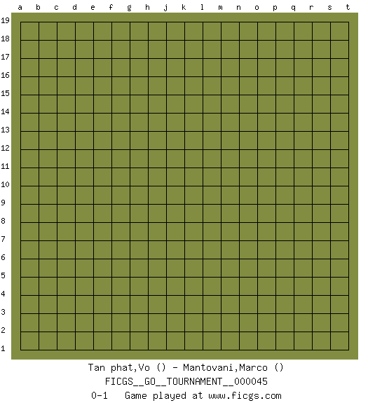 Last move : 0-1 2019 September 18 2:37:13 [Event "FICGS__GO__TOURNAMENT__000045"] [Site "FICGS"] [Date "2019.08.18"] [Round "1"] [Black "Tan phat,Vo"] [White "Mantovani,Marco"] [Result "0-1"] 0-1 This go game has been lost on time (started : 2019.08.18 23:19:42) Here are the names of the openings (joseki) played in the four corners : Player White won this Go (weiqi, baduk) game. Follow this game move after move (download)Against three in a row, play right in the center. (Anonymous) You must do what you feel is right... of course. (Obi-Wan Kenobi in Star Wars ep.4)