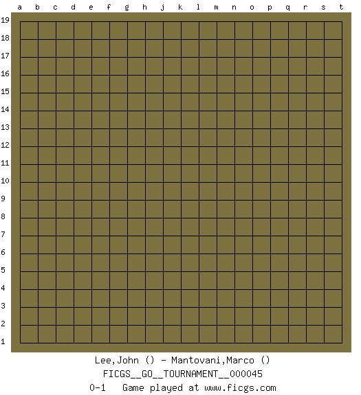 Last move : 0-1 2019 September 18 2:37:13 [Event "FICGS__GO__TOURNAMENT__000045"] [Site "FICGS"] [Date "2019.08.18"] [Round "1"] [Black "Lee,John"] [White "Mantovani,Marco"] [Result "0-1"] 0-1 This go game has been lost on time (started : 2019.08.18 23:19:42) Here are the names of the openings (joseki) played in the four corners : Player White won this Go (weiqi, baduk) game. Follow this game move after move (download)Don't make territory near thickness. (Anonymous) There are two kinds of people in the world, my friend. Those who have a loaded gun and those who dig. You dig ! (Blondie in The Good, The Bad and The Ugly)