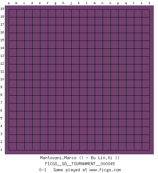 Last move : 0-1 2019 September 18 2:37:13 [Event "FICGS__GO__TOURNAMENT__000045"] [Site "FICGS"] [Date "2019.08.18"] [Round "1"] [Black "Mantovani,Marco"] [White "Bu Lin,Xi"] [Result "0-1"] 0-1 This go game has been lost on time (started : 2019.08.18 23:19:42) Here are the names of the openings (joseki) played in the four corners : Player White won this Go (weiqi, baduk) game. Follow this game move after move (download)The monkey jump is worth eight points. (Anonymous) Life is the sum of all your choices. (Albert Camus)