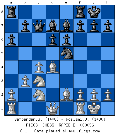 Last move : 0-1 2007 August 11 15:5:27 [Event "FICGS__CHESS__RAPID_B__000056"] [Site "FICGS"] [Date "2007.06.20"] [Round "1"] [White "Sambandan,Sanjiv"] [Black "Goswami,Deepjyoti"] [Result "0-1"] [WhiteElo "1400"] [BlackElo "1490"] 1.e4 c5 2.c4 Nc6 3.d3 Nd4 4.e5 d6 5.Bf4 e6 6.Nf3 Qb6 7.b3 Bd7 8.Nxd4 Ne7 9.Nc2 Ng6 10.Be3 Nxe5 11.d4 cxd4 12.Bxd4 Qc7 13.Be2 Be7 14.O-O O-O 15.Nc3 a6 0-1 This chess game has been lost on time (started : 2007.06.20 12:13:33) Sicilian defense Kingside Castling by player White (move 14) Kingside Castling by player Black (move 14) Player Black won this chess game. Follow this game move after move (download)A player surprised is half beaten. (Proverb) Ich bin stolz ein Bulgare zu sein. (Veselin Topalov) Todos los Maestros de Ajedrez fueron un día unos principiantes. (Chernev) L'action d'une oeuvre littéraire se déroule sur un champ de bataille. Les masques et les types du drame moderne correspondent aux pièces du jeu d'échecs. L'intrigue correspond aux coups et aux gambits, c'est à dire aux techniques du jeu telles qu'utilisées et interprétées par les joueurs. Les tactiques et les péripéties [mouvements] correspondent aux coups exécutés par l'adversaire. (Viktor Shklovsky) The beginning is the most important part of the work. (Plato)