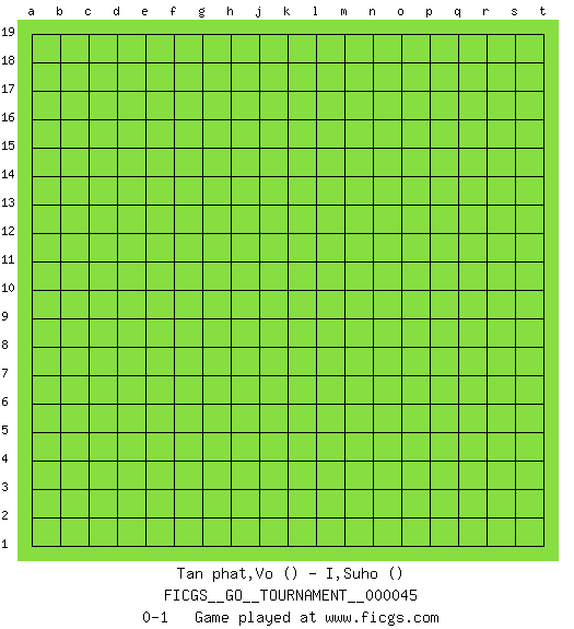 Last move : 0-1 2019 September 18 2:37:13 [Event "FICGS__GO__TOURNAMENT__000045"] [Site "FICGS"] [Date "2019.08.18"] [Round "1"] [Black "Tan phat,Vo"] [White "I,Suho"] [Result "0-1"] 0-1 This go game has been lost on time (started : 2019.08.18 23:19:42) Here are the names of the openings (joseki) played in the four corners : Player White won this Go (weiqi, baduk) game. Follow this game move after move (download)The nature of a game comes from what is played, but it's the sensitivity to the possible and the impossible that gives it value. (Pierre Audouard) Gambling : The sure way of getting nothing from something. (Wilson Mizner)