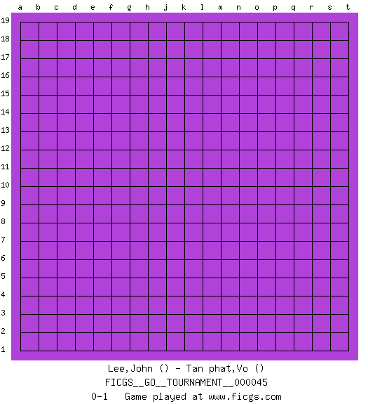Last move : 0-1 2019 September 18 2:37:13 [Event "FICGS__GO__TOURNAMENT__000045"] [Site "FICGS"] [Date "2019.08.18"] [Round "1"] [Black "Lee,John"] [White "Tan phat,Vo"] [Result "0-1"] 0-1 This go game has been lost on time (started : 2019.08.18 23:19:42) Here are the names of the openings (joseki) played in the four corners : Player White won this Go (weiqi, baduk) game. Follow this game move after move (download)For rectangular six in the corner, dame is necessary. (Anonymous) A good book on your shelf is a friend that turns its back on you and remains a friend. (Author unknown)
