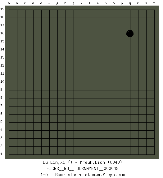 Last move : 1-0 2019 September 18 14:53:47 [Event "FICGS__GO__TOURNAMENT__000045"] [Site "FICGS"] [Date "2019.08.18"] [Round "1"] [Black "Bu Lin,Xi"] [White "Kreuk,Dion"] [Result "1-0"] [Rating 2 "0949"] 1.q16 1-0 This go game has been lost on time (started : 2019.08.18 23:19:42) Here are the names of the openings (joseki) played in the four corners : Player Black won this Go (weiqi, baduk) game. Follow this game move after move (download)Avoid the plate connection. (Anonymous) There's no money in correspondence chess. (John Knudsen)