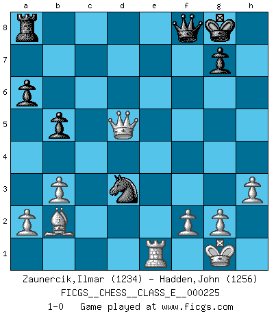 Last move : 1-0 2019 November 8 2:18:48 [Event "FICGS__CHESS__CLASS_E__000225"] [Site "FICGS"] [Date "2019.08.19"] [Round "1"] [White "Zaunercik,Ilmar"] [Black "Hadden,John"] [Result "1-0"] [WhiteElo "1234"] [BlackElo "1256"] 1.e4 e5 2.Nf3 Nc6 3.Bb5 a6 4.Ba4 b5 5.Bb3 d6 6.c3 Be6 7.Bxe6 fxe6 8.O-O h6 9.d4 exd4 10.cxd4 Be7 11.Nc3 Qd7 12.d5 exd5 13.Nxd5 Nf6 14.Re1 O-O 15.Nxe7+ Nxe7 16.Qb3+ Kh7 17.Qc2 Kh8 18.e5 Ng4 19.e6 Qc8 20.b3 Rf6 21.h3 Ne5 22.Nxe5 dxe5 23.Rxe5 Rxe6 24.Qe4 Rxe5 25.Qxe5 Ng6 26.Qg3 Ne7 27.Bb2 Nf5 28.Qe5 Qf8 29.Qxc7 Ne7 30.Re1 Nd5 31.Qc6 Nb4 32.Qxh6+ Kg8 33.Qg5 Nd3 34.Qd5+ 1-0 Ruy Lopez : Caro variation Kingside Castling by player White (move 8) Kingside Castling by player Black (move 14) Player White won this chess game. Follow this game move after move (download)Chess problems demand from the composer the same virtues that characterize all worthwhile art: originality, invention, conciseness, harmony, complexity, and splendid insincerity. (Vladimir Nabokov) Im Internet Chess Club betrug mein Rating vorübergehend 3350 ELO-Punkte. (Sergej Karjakin) Para mi, el Ajedrez es la vida y cada partida es como una nueva vida. Todo jugador de Ajedrez suele vivir muchas vidas durante su vida. (Eduard Gufeld) Lorsque vous vous retrouvez devant une position atroce, ne tendez pas un ultime piège dérisoire avec l'intention d'abandonner si l'adversaire le déjoue ! Faites-vous plutôt un devoir de résister comme si votre vie en dépendait. Jouez le coup qui vous déplairait au centuple si vous étiez dans la peau de votre tortionnaire ! Is not life a hundred times too short to bore ourselves ? (Friedrich Nietzsche)