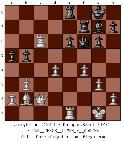 Last move : 0-1 2019 October 10 7:30:8 [Event "FICGS__CHESS__CLASS_E__000225"] [Site "FICGS"] [Date "2019.08.19"] [Round "1"] [White "Wood,Brian"] [Black "Kalapos,Karol"] [Result "0-1"] [WhiteElo "1231"] [BlackElo "1274"] 1.f4 g6 2.Nf3 Nf6 3.g3 Bg7 4.Bg2 O-O 5.O-O e6 6.e3 d5 7.d4 c6 8.b3 Nfd7 9.Bb2 c5 10.c4 Nc6 11.Nc3 cxd4 12.Nxd4 Nxd4 13.exd4 Nb6 14.cxd5 Nxd5 15.Nxd5 exd5 16.Qd2 Be6 17.Rac1 b6 18.Ba3 Re8 19.Rfe1 Qf6 20.Bb2 a5 21.Rc6 b5 22.Bxd5 Ra7 23.Bxe6 fxe6 24.Qc2 Rf7 0-1 Bird's Opening Kingside Castling by player Black (move 4) Kingside Castling by player White (move 5) Player Black won this chess game. Follow this game move after move (download)It's always better to sacrifice your opponent's men. (Savielly Tartakover) Wer wird heute Abend ihr Gegner sein? -- Heute Abend spiele ich gegen die schwarzen Steine. (Akiba Rubinstein) Tu puedes aprender mucho mas de una partida que pierdas que de una partida ganada. Tendras que perder cientos de partidas antes de llegar a ser un buen jugador. (Jose Raul Capablanca) Des combinaisons [dans le jeu d'échecs] pareilles à des mélodies. Je crois entendre pour ainsi dire la musique des coups... (Vladimir Nabokov) There is no vagueness without wind. (Chinese proverb)