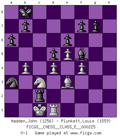 Last move : 0-1 2020 January 8 19:36:48 [Event "FICGS__CHESS__CLASS_E__000225"] [Site "FICGS"] [Date "2019.08.19"] [Round "1"] [White "Hadden,John"] [Black "Plunkett,Louis"] [Result "0-1"] [WhiteElo "1256"] [BlackElo "1559"] 1.d4 d5 2.Nc3 Nc6 3.Nf3 Bg4 4.h3 Bh5 5.g4 Bg6 6.e3 Nb4 7.Bd3 Nf6 8.a3 Nxd3+ 9.cxd3 e6 10.Ne5 Bd6 11.h4 h6 12.g5 Bxe5 13.dxe5 Bh5 14.Qd2 Nd7 15.b4 hxg5 16.hxg5 Qxg5 17.f4 Qg3+ 18.Qf2 Qxf2+ 19.Kxf2 O-O-O 20.e4 c6 21.exd5 cxd5 22.Be3 a6 23.Rhg1 Bg6 24.d4 Nb6 25.Rac1 Kb8 26.Rh1 Nc4 27.Rxh8 Rxh8 28.Re1 Nxa3 29.Ke2 Rh2+ 30.Kd1 Bc2+ 31.Kc1 Bf5 32.Rd1 Rc2+ 0-1 Queen's pawn : Chigorin variation Queenside Castling by player Black (move 19) Player Black won this chess game. Follow this game move after move (download)Chess is no whit inferior to the violin, and we have a large number of professional violinists. (Mikhail Botvinnik) Wie bekannt hörte Morphy 1859 auf, Schach zu spielen. Seine Enttäuschung galt nicht so sehr dem Schach, wie den Schachspielern. (Robert James Fischer) La pasion por jugar al Ajedrez es una de las mas inexplicables en el mundo. (H.G. Wells) La conception d'un plan est le processus par lequel un joueur exploite les avantages de sa position tout en s'efforçant d'en réduire au minimum les inconvénients. Afin de garantir le succès, un plan doit toujours se fonder sur un diagnostic objectif des particularités d'une position. La conception d'un plan est d'autant plus difficile que la position est équilibrée, et grandement facilitée lorsqu'il n'existe qu'un seul plan susceptible de répondre aux exigences de la position. (Harry Golombek) The question of whether computers can think is just like question of whether submarines can swim. (Edsger W. Dijkstra)