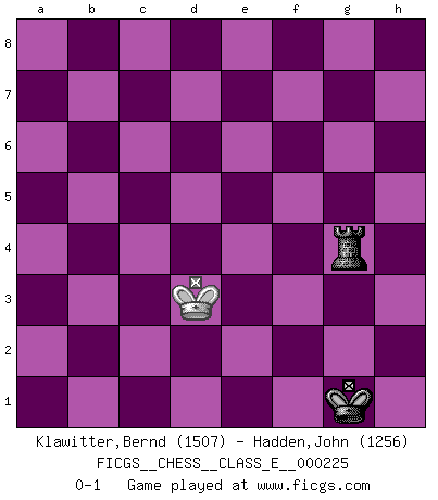 Last move : 0-1 2020 May 20 20:35:47 [Event "FICGS__CHESS__CLASS_E__000225"] [Site "FICGS"] [Date "2019.08.19"] [Round "1"] [White "Klawitter,Bernd"] [Black "Hadden,John"] [Result "0-1"] [WhiteElo "1507"] [BlackElo "1256"] 1.b3 e5 2.Bb2 Nc6 3.a3 Nf6 4.e3 d6 5.Be2 Be6 6.d3 Be7 7.Nf3 O-O 8.O-O d5 9.Nxe5 Nxe5 10.Bxe5 Bd6 11.Bxd6 Qxd6 12.Nd2 d4 13.e4 c5 14.Nc4 Qc7 15.Bf3 b5 16.Nd2 a5 17.h3 Nd7 18.Qe2 a4 19.Bg4 Bxg4 20.Qxg4 Nf6 21.Qf3 axb3 22.cxb3 Ra6 23.Rfe1 Qe5 24.Qd1 h6 25.Rf1 Nh5 26.Nf3 Qf4 27.Qc1 Rg6 28.Qxf4 Nxf4 29.g3 Nxh3+ 30.Kh2 Ng5 31.Nxg5 Rxg5 32.f4 Rg6 33.Rac1 Rc8 34.e5 Ra6 35.Ra1 Rca8 36.Rfc1 Rxa3 37.Rxa3 Rxa3 38.Rxc5 Rxb3 39.Rd5 Rxd3 40.Rxb5 Re3 41.Rd5 Rd3 42.Kg2 g6 43.Kf2 Rd2+ 44.Kf3 Rd3+ 45.Kf2 Kg7 46.g4 g5 47.fxg5 hxg5 48.Ke2 Re3+ 49.Kf2 Re4 50.Kf3 Rf4+ 51.Kg3 Kg6 52.Rd6+ Kg7 53.Rd7 Re4 54.Rd5 Kf8 55.Kf3 Rf4+ 56.Kg3 Ke7 57.Ra5 Ke6 58.Rb5 Re4 59.Kf3 Rxe5 60.Rb6+ Ke7 61.Ra6 Re6 62.Ra7+ Kf6 63.Ra5 d3 64.Rd5 Kg6 65.Rxd3 f5 66.gxf5+ Kxf5 67.Rd5+ Re5 68.Rd4 Kg6 69.Rb4 Kh5 70.Kg3 Re3+ 71.Kf2 Rc3 72.Kg2 g4 73.Kf2 Kh4 74.Rd4 Kh3 75.Rd2 g3+ 76.Ke1 Rc1+ 77.Ke2 g2 78.Rd3+ Kh2 79.Rd8 g1Q 80.Rh8+ Kg2 81.Rg8+ Kh1 82.Rxg1+ Kxg1 83.Kd2 Rc4 84.Kd3 Rg4 0-1 Nimzovich-Larsen attack : Modern variation Kingside Castling by player Black (move 7) Kingside Castling by player White (move 8) 10 pieces endgame at move 47 : White KRPPP , Black KRPPP WHITE : King + 1 Rook 3 Pawns BLACK : King + 1 Rook 3 Pawns 9 pieces endgame at move 47 : White KRPP , Black KRPPP WHITE : King + 1 Rook 2 Pawns BLACK : King + 1 Rook 3 Pawns 8 pieces endgame at move 59 : White KRP , Black KRPPP WHITE : King + 1 Rook 1 Pawn BLACK : King + 1 Rook 3 Pawns 7 pieces endgame at move 65 : White KRP , Black KRPP WHITE : King + 1 Rook 1 Pawn BLACK : King + 1 Rook 2 Pawns 6 pieces endgame at move 66 : White KRP , Black KRP WHITE : King + 1 Rook 1 Pawn BLACK : King + 1 Rook 1 Pawn 5 pieces endgame at move 66 : White KR , Black KRP WHITE : King + 1 Rook BLACK : King + 1 Rook 1 Pawn Promotion Queen by player Black (move 79) 4 pieces endgame at move 82 : White KR , Black KR WHITE : King + 1 Rook BLACK : King + 1 Rook 3 pieces endgame at move 82 : White K , Black KR WHITE : King + BLACK : King + 1 Rook Player Black won this chess game. Follow this game move after move (download)I like to say that Bobby Fischer was the greatest player ever. But what made Fischer a genius was his ability to blend an American freshness and pragmatism with Russian ideas about strategy. (Bruce Pandolfini) Das typische an einem Großmeister ist, daß er eine gewonnene Position schnell und schmerzlos gewinnt. (Irving Chernev) Yo nunca en mi vida he jugado la Defensa Francesa, que viene siendo la más aburrida de todas las Aperturas. (Wilhelm Steinitz) Le moment que je préfère le plus dans une rencontre, c'est celui où je sens que la personnalité de l'adversaire se brise. (Robert Fischer) May I never be complete. May I never be content. May I never be perfect. Deliver me, Tyler, from being perfect and complete. (Chuck Palahniuk, Fight Club)