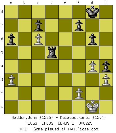 Last move : 0-1 2019 November 17 23:25:10 [Event "FICGS__CHESS__CLASS_E__000225"] [Site "FICGS"] [Date "2019.08.19"] [Round "1"] [White "Hadden,John"] [Black "Kalapos,Karol"] [Result "0-1"] [WhiteElo "1256"] [BlackElo "1274"] 1.d4 Nf6 2.Nf3 g6 3.Nc3 e6 4.e3 Bg7 5.Bd3 b6 6.a3 Bb7 7.O-O d6 8.b4 Nbd7 9.Bb2 O-O 10.Re1 Nd5 11.Nxd5 Bxd5 12.c4 Bb7 13.Rb1 Re8 14.e4 a6 15.d5 exd5 16.Bxg7 Kxg7 17.exd5 Ne5 18.Nxe5 dxe5 19.Qg4 Bc8 20.Qg3 Qf6 21.Re4 Bf5 22.Re3 e4 23.Qf4 exd3 24.Rd1 Qd8 25.Qd4+ Kg8 26.h3 h5 27.g4 Qg5 28.Rg3 h4 29.Rgxd3 Bxd3 30.Qxd3 Rad8 31.Qd2 Qxd2 32.Rxd2 Re4 33.c5 bxc5 34.bxc5 Ra4 35.Rd3 Ra5 36.c6 R8xd5 37.Rxd5 Rxd5 0-1 King's Indian : East Indian defense Kingside Castling by player White (move 7) Kingside Castling by player Black (move 9) Player Black won this chess game. Follow this game move after move (download)It was clear to me that the vulnerable point of the American Grandmaster (Bobby Fischer) was in double-edged, hanging, irrational positions, where he often failed to find a win even in a won position. (Efim Geller) Es ist wirklich schade, dass so viele Schachspieler nicht auf ihr Äußeres achten! (Alexandra Kosteniuk) El pensamiento metódico es mas útil en el Ajedrez que la inspiración. (C. J. S. Purdy) Aux échecs, les retours au sommet sont rares : les dommages psychologiques consécutifs à une défaite sont trop sévères. (Daily Telegraph) There are lots of people who mistake their imagination for their memory. (Josh Bilings)