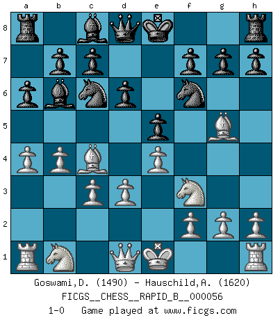 Last move : 1-0 2007 August 6 14:22:8 [Event "FICGS__CHESS__RAPID_B__000056"] [Site "FICGS"] [Date "2007.06.20"] [Round "1"] [White "Goswami,Deepjyoti"] [Black "Hauschild,Achim"] [Result "1-0"] [WhiteElo "1490"] [BlackElo "1620"] 1.e4 e5 2.Nf3 Nc6 3.Bc4 Bc5 4.c3 Nf6 5.d3 d6 6.b4 Bb6 7.a4 a6 8.Bg5 1-0 This chess game has been lost on time (started : 2007.06.20 12:13:33) Giuoco Piano Player White won this chess game. Follow this game move after move (download)He who fears an isolated Queen's Pawn should give up Chess. (Siegbert Tarrasch) Als er Schachweltmeister wurde ließ er praktisch alle stärksten Sovietspieler für sich arbeiten. Wenn ein auch nur mittelmässiger Meister ein Spezialist für eine bestimmte Eröffnung war, wurde er von Karpov gerufen. Das wurde alles geheim gehalten. (Mikhail Moiseyevich Botvinik) Si el Ajedrez es una ciencia, es la mas inexacta. Si el Ajedrez es un arte, es demasiado inexacto para ser visto como tal. Si el Ajedrez es un deporte, es demasiado esotérico. Si el Ajedrez es un juego, es demasiado exigente para ser solo un juego. Si el Ajedrez es una aventura, es una muy demandante. Si el Ajedrez es una pasión, es una muy gratificante. Si el Ajedrez es la vida, es una muy triste. (Anónimo) Vous m'avez demandé de vous exposer quel est le fondement de la prière. Je ne fais que préparer les pièces du jeu sur la table... Nous sera-t-il permis d'en adopter les règles et si nous les appliquons scrupuleusement nous ne tarderons pas à faire mat le Roi divin ! Il ne pourra échapper à nos mains. (Sainte Thérèse d'Avila, Chemin de perfection) Statistics can be made to prove anything - even the truth. (Author unknown)