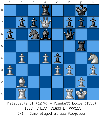 Last move : 0-1 2019 September 2 15:11:55 [Event "FICGS__CHESS__CLASS_E__000225"] [Site "FICGS"] [Date "2019.08.19"] [Round "1"] [White "Kalapos,Karol"] [Black "Plunkett,Louis"] [Result "0-1"] [WhiteElo "1274"] [BlackElo "1559"] 1.d4 d5 2.c4 Nc6 3.Nf3 Bg4 4.e3 e6 5.Nc3 Nf6 6.Be2 Bd6 7.cxd5 exd5 8.O-O O-O 9.a3 a6 10.h3 Bh5 11.Nh4 Bxe2 12.Qxe2 Ne4 13.Nxe4 dxe4 14.Qg4 Re8 15.Nf5 Qf6 16.b4 Bf8 17.Bb2 Rad8 18.Rab1 Rd5 19.Nh4 Bd6 20.f3 Rg5 21.Qd7 Rd8 0-1 QGD : Chigorin defense Kingside Castling by player White (move 8) Kingside Castling by player Black (move 8) Player Black won this chess game. Follow this game move after move (download)If your opponent cannot do anything active, then don't rush the position; instead you should let him sit there, suffer, and beg you for a draw. (Jeremy Silman) Aljechin war kein Nazi. Er war ein Opportunist. Ein schrecklicher Mann. Er liebte Geld über alles und würde für Geld ein Jude, ein Katolik oder ein Protestant werden. (Miguel Najdorf) Preferería tener un Peón que un dedo. (Reuben Fine) Karpov est une pièce de musée. (Garry Kasparov) Life is pleasant. Death is peaceful. It's the transition that's troublesome. (Isaac Asimov)