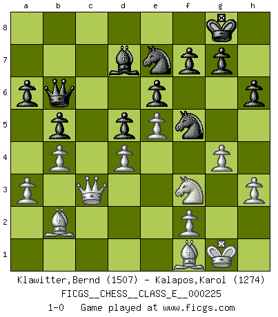 Last move : 1-0 2019 September 4 8:42:4 [Event "FICGS__CHESS__CLASS_E__000225"] [Site "FICGS"] [Date "2019.08.19"] [Round "1"] [White "Klawitter,Bernd"] [Black "Kalapos,Karol"] [Result "1-0"] [WhiteElo "1507"] [BlackElo "1274"] 1.d4 e6 2.e4 d5 3.e5 c5 4.c3 Nc6 5.Nf3 Qb6 6.Be2 Be7 7.O-O h6 8.a3 cxd4 9.cxd4 a6 10.Nc3 Bd8 11.Na4 Qc7 12.b4 b5 13.Nc5 Nge7 14.Bb2 Nf5 15.Re1 O-O 16.Bf1 Be7 17.Rc1 Bxc5 18.Rxc5 Qb6 19.Qd2 Bd7 20.Rec1 Rfc8 21.h3 Nce7 22.Rxc8+ Rxc8 23.Rxc8+ Nxc8 24.Qc3 Nce7 25.g4 1-0 Queen's pawn Kingside Castling by player White (move 7) Kingside Castling by player Black (move 15) Player White won this chess game. Follow this game move after move (download)When you don't know what to play, wait for an idea to come into your opponent's mind. You may be sure that idea will be wrong. (Siegbert Tarrasch) Ich kämpfe solange mein Gegner einen Fehler machen kann. (Emanuel Lasker) Solo existe una cosa que Fischer hace en el Ajedrez sin placer: ¡perder!. (Boris Spassky) Assurément je connaissais par expérience le mystérieux attrait de ce jeu royal, le seul entre tous les jeux inventés par les hommes qui échappe souverainement à la tyrannie du hasard, le seul où l'on ne doive sa victoire qu'à son intelligence ou plutôt à une certaine forme d'intelligence. Mais n'est-ce pas déjà le limiter injurieusement que d'appeler les échecs un jeu ? N'est-ce pas une science, un art ou quelque chose qui, comme le cercueil de Mahomet entre ciel et terre, est suspendu entre l'un et l'autre, et qui réunit un nombre incroyable de contraires ? [...] C'est une pensée qui ne mène à rien, une mathématique qui n'établit rien, un art qui ne laisse pas d'uvre, une architecture sans matière; et il l'a prouvé néanmoins qu'il était plus durable, à sa manière, que les livres ou que tout autre monument, ce jeu unique qui appartient à tous les peuples et à tous les temps, et dont personne ne sait quel dieu en fit don à la terre pour tuer l'ennui, pour aiguiser l'esprit et stimuler l'âme. Où commence-t-il, où finit-il ? (Stefan Zweig) Ah, the Socrating method. The best way we have of teaching everything-apart from juggling chainsaws. (Gregory House, House M.D.)