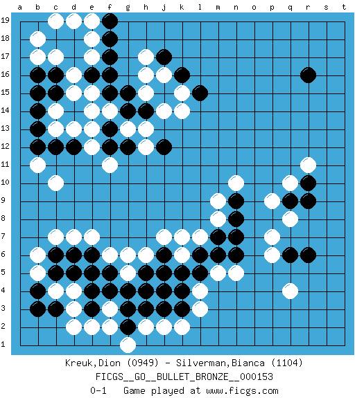 Last move : 0-1 2019 August 20 8:16:57 [Event "FICGS__GO__BULLET_BRONZE__000153"] [Site "FICGS"] [Date "2019.08.20"] [Round "1"] [Black "Kreuk,Dion"] [White "Silverman,Bianca"] [Result "0-1"] [Rating 1 "0949"] [Rating 2 "1104"] 1.d17 q4 2.r16 d4 3.c3 c4 4.b4 b5 5.b3 d3 6.c5 b6 7.c6 c7 8.d6 d7 9.e6 e7 10.f4 f6 11.e5 f3 12.e3 e2 13.e4 d2 14.g3 f2 15.h4 g5 16.g4 h2 17.h3 j2 18.h5 h6 19.f5 g6 20.g2 g1 21.k4 l3 22.k3 k2 23.r6 l4 24.j6 j7 25.k5 k6 26.l5 m5 27.l6 j5 28.j4 l7 29.m6 n5 30.j6 k7 31.m7 m8 32.n8 m9 33.n7 d15 34.q9 c17 35.c16 d16 36.c15 c14 37.c18 b17 38.b15 b18 39.d14 e17 40.d18 e18 41.e16 e15 42.f16 e14 43.d12 d13 44.c12 e12 45.b14 c13 46.b13 b11 47.f17 c19 48.k16 h17 49.j17 h16 50.f18 e19 51.f19 d19 52.b12 c10 53.f13 e13 54.f15 f14 55.g15 h15 56.g14 k15 57.l15 k14 58.j12 h13 59.f12 f11 60.b16 g13 61.g12 h12 62.d5 j16 63.h14 j14 64.j3 q10 65.r9 p9 66.j5 q8 67.r10 r11 68.q6 p7 69.n6 p6 70.n9 n10 0-1 Here are the names of the openings (joseki) played in the four corners : Corner d4 : d4 c3 Hoshi (Hwajeom, Seongjeom, Xingwei`) 4-4 Point. The star or hoshi (4-4) point, emphasizing influence at the potential expense of territory. Corner d16 : d17 d15 Komoku (Somok, Xiao~mu`) 3-4 Point. The komoku (3-4) point is the traditional corner enclosure move.. Ikken Takagakari (Hankan Nop'dakeolch'im, Yi Gaogua`jiao~, 1-Space High Approach). The 5-4 approach move has become more popular in modern times, as modern Go emphasizes speed and influence. Player White won this Go (weiqi, baduk) game. Follow this game move after move (download)There are possible things, impossible things, and things that happen. Sometimes things happen that were impossible. (Pierre Audouard) May I never be complete. May I never be content. May I never be perfect. Deliver me, Tyler, from being perfect and complete. (Chuck Palahniuk, Fight Club)