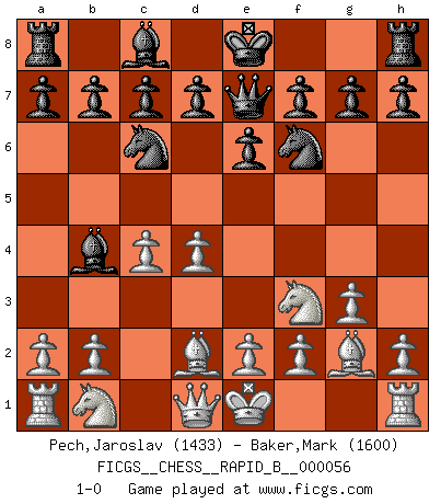 Last move : 1-0 2007 August 11 15:5:27 [Event "FICGS__CHESS__RAPID_B__000056"] [Site "FICGS"] [Date "2007.06.20"] [Round "1"] [White "Pech,Jaroslav"] [Black "Baker,Mark"] [Result "1-0"] [WhiteElo "1433"] [BlackElo "1600"] 1.d4 Nf6 2.c4 e6 3.Nf3 Bb4+ 4.Bd2 Qe7 5.g3 Nc6 6.Bg2 1-0 This chess game has been lost on time (started : 2007.06.20 12:13:33) Bogo-Indian defense, Nimzovich variation Player White won this chess game. Follow this game move after move (download)An attack on the wing should be met by play in the center. (Nimzovitch) Garry Kasparov war erst in der Großmeister-Organisation GMA, dann in der Profischach-Vereinigung PCA, zum Schluss kehrte er wieder in den Schoß der FIDE zurück. Aber gut, manche Leute sind flexibel (Viswanathan Anand) Muchos jugadores de Ajedrez se sorprendían cuando después de la partida, Fischer explicaba con calma: 'Yo ya había analizado esta posibilidad' en una posición en la cual yo creía que no era posible de prever desde la apertura. (Mikhail Tal) Il a essayé de se convaincre qu'il pourrait empêcher toutes les erreurs et ne jamais perdre. L'horreur ! Gary Kasparov au sujet de Robert Fischer. Wikichess, chess moves explained by 'experimented' players. (Thibault de Vassal)