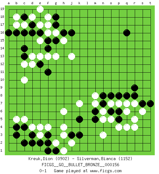 Last move : 0-1 2019 August 20 9:6:6 [Event "FICGS__GO__BULLET_BRONZE__000156"] [Site "FICGS"] [Date "2019.08.20"] [Round "1"] [Black "Kreuk,Dion"] [White "Silverman,Bianca"] [Result "0-1"] [Rating 1 "0902"] [Rating 2 "1152"] 1.d16 q4 2.q16 d4 3.k3 n3 4.f3 h3 5.j3 h4 6.k5 h6 7.d3 c3 8.c2 e3 9.d2 e4 10.c4 c5 11.b4 b5 12.b3 c10 13.c14 k7 14.m5 m7 15.h2 g2 16.f2 j2 17.e2 f4 18.g1 h1 19.f1 c12 20.e12 d13 21.g17 e13 22.c13 d12 23.f11 g13 24.g15 j13 25.r6 r4 26.r9 o5 27.n7 n6 28.m6 m8 29.o6 n5 30.p6 o7 31.p5 p4 32.o8 p7 33.n8 q6 34.p8 q7 35.r8 r7 36.s7 s6 37.q8 r5 38.t7 c17 39.c16 d18 40.e18 e17 41.d17 f18 42.c18 e19 43.g18 b17 44.b16 b18 45.a16 f16 46.f15 g16 47.h16 h15 48.j16 e15 49.e16 f17 50.f14 f13 0-1 Here are the names of the openings (joseki) played in the four corners : Corner d4 : d4 f3 Hoshi (Hwajeom, Seongjeom, Xingwei`) 4-4 Point. The star or hoshi (4-4) point, emphasizing influence at the potential expense of territory. Ikken Kakari (Hankan Keolch'im, Yi Gua`jiao~, 1-Space Low Approach). Black 2 is the standard approach move to the 4-4. Player White won this Go (weiqi, baduk) game. Follow this game move after move (download)Add one stone, then sacrifice both. (Anonymous) At work, the authority of a person is inversely proportional to the number of pens that person is carrying. (Dan Rotaru)
