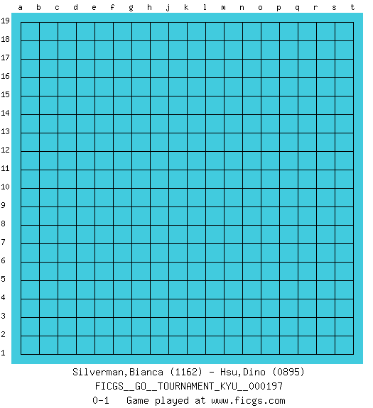 Last move : 0-1 2019 September 19 18:5:46 [Event "FICGS__GO__TOURNAMENT_KYU__000197"] [Site "FICGS"] [Date "2019.08.20"] [Round "1"] [Black "Silverman,Bianca"] [White "Hsu,Dino"] [Result "0-1"] [Rating 1 "1162"] [Rating 2 "0895"] 0-1 This go game has been lost on time (started : 2019.08.20 9:10:37) Here are the names of the openings (joseki) played in the four corners : Player White won this Go (weiqi, baduk) game. Follow this game move after move (download)Atari, atari is vulgar play. (Anonymous) For to win one hundred victories in one hundred battles is not the acme of skill. To subdue the enemy without fighting is the acme of skill. (Sun Tzu)