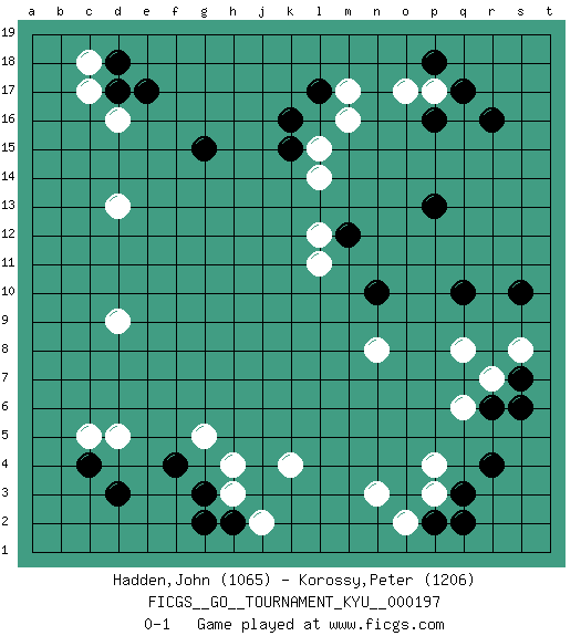 Last move : 0-1 2019 November 11 16:22:23 [Event "FICGS__GO__TOURNAMENT_KYU__000197 "] [Site "FICGS"] [Date "2019.08.20"] [Round "1"] [Black "Hadden,John "] [White "Korossy,Peter "] [Result "0-1"] [Rating 1 "1065"] [Rating 2 "1206"] 1.r16 d16 2.r4 p3 3.q3 p4 4.q10 k4 5.d3 c5 6.c4 d5 7.f4 d9 8.d17 c17 9.e17 c18 10.d18 d13 11.k16 p17 12.q17 m17 13.l17 m16 14.g15 q6 15.r6 r7 16.s6 q8 17.s7 s8 18.s10 h3 19.g3 h4 20.p16 o17 21.p18 l15 22.k15 l14 23.p13 l12 24.n10 n8 25.m12 l11 26.p2 o2 27.q2 n3 28.h2 j2 29.g2 g5 0-1 This go game has been lost on time (started : 2019.08.20 9:10:37) Here are the names of the openings (joseki) played in the four corners : Corner q4 : r4 p3Komoku (Somok, Xiao~mu`) 3-4 Point. The komoku (3-4) point is the traditional corner enclosure move..Ikken Kakari (Hankan Keolch'im, Yi Gua`jiao~, 1-Space Low Pincer). The small knight move is the basic approach move to the 3-4 point stone. It has been continually used for over four centuries. There are limitless variations, with new moves constantly being discovered. White 2 opens the door to a treaure store of joseki. Corner d4 : d3 c5Komoku (Somok, Xiao~mu`) 3-4 Point. The komoku (3-4) point is the traditional corner enclosure move..Ikken Kakari (Hankan Keolch'im, Yi Gua`jiao~, 1-Space Low Pincer). The small knight move is the basic approach move to the 3-4 point stone. It has been continually used for over four centuries. There are limitless variations, with new moves constantly being discovered. White 2 opens the door to a treaure store of joseki. Corner d16 : d16 d17Hoshi (Hwajeom, Seongjeom, Xingwei`) 4-4 Point. The star or hoshi (4-4) point, emphasizing influence at the potential expense of territory. Corner q16 : r16 p17Komoku (Somok, Xiao~mu`) 3-4 Point. The komoku (3-4) point is the traditional corner enclosure move..Ikken Kakari (Hankan Keolch'im, Yi Gua`jiao~, 1-Space Low Pincer). The small knight move is the basic approach move to the 3-4 point stone. It has been continually used for over four centuries. There are limitless variations, with new moves constantly being discovered. White 2 opens the door to a treaure store of joseki. Player White won this Go (weiqi, baduk) game.Follow this game move after move (download ) Don't make empty triangles. (Anonymous) Children in the dark cause accidents, accidents in the dark cause children. (Unknown)