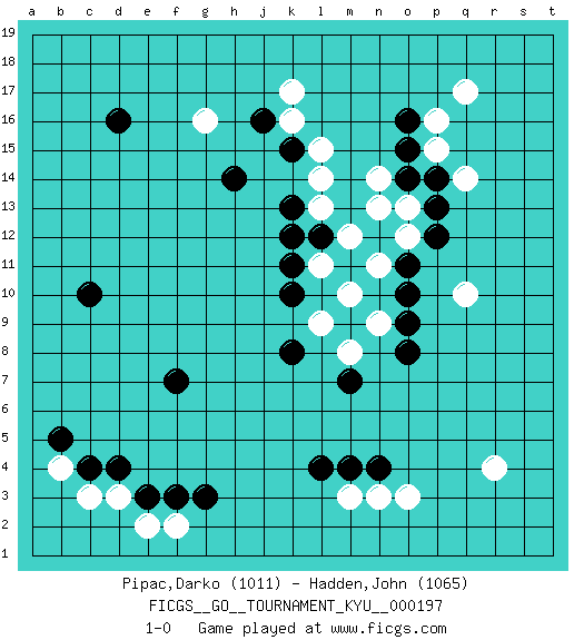 Last move : 1-0 2019 November 11 4:0:28 [Event "FICGS__GO__TOURNAMENT_KYU__000197"] [Site "FICGS"] [Date "2019.08.20"] [Round "1"] [Black "Pipac,Darko"] [White "Hadden,John"] [Result "1-0"] [Rating 1 "1011"] [Rating 2 "1065"] 1.d16 r4 2.d4 q17 3.c10 d3 4.e3 c3 5.c4 e2 6.f3 f2 7.g3 o3 8.k10 q10 9.n4 n3 10.m4 m3 11.l4 m8 12.o16 p16 13.o15 p15 14.p14 q14 15.p13 k16 16.h14 g16 17.o8 m10 18.o10 l9 19.k8 l11 20.k11 l13 21.k13 l14 22.k15 l15 23.j16 k17 24.l12 m12 25.k12 n11 26.o11 o12 27.p12 n13 28.m7 n9 29.o9 o13 30.o14 n14 31.f7 b4 32.b5 1-0 This go game has been lost on time (started : 2019.08.20 9:10:37) Here are the names of the openings (joseki) played in the four corners : Corner d4 : d4 d3 Hoshi (Hwajeom, Seongjeom, Xingwei`) 4-4 Point. The star or hoshi (4-4) point, emphasizing influence at the potential expense of territory. Corner q16 : q17 o16 Komoku (Somok, Xiao~mu`) 3-4 Point. The komoku (3-4) point is the traditional corner enclosure move.. Player Black won this Go (weiqi, baduk) game. Follow this game move after move (download)... {it is} something unearthly... if there are sentient beings on other planets, then they play go. (Emanuel Lasker, chess world champion) Good luck. You're gonna need it. (Han Solo in Star Wars ep.6)