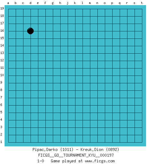 Last move : 1-0 2019 September 20 7:48:36 [Event "FICGS__GO__TOURNAMENT_KYU__000197"] [Site "FICGS"] [Date "2019.08.20"] [Round "1"] [Black "Pipac,Darko"] [White "Kreuk,Dion"] [Result "1-0"] [Rating 1 "1011"] [Rating 2 "0892"] 1.d16 1-0 This go game has been lost on time (started : 2019.08.20 9:10:37) Here are the names of the openings (joseki) played in the four corners : Player Black won this Go (weiqi, baduk) game. Follow this game move after move (download)The strong player plays straight, the weak diagonally. (Anonymous) There's always a bigger fish. (Qui-Gon Jinn in Star Wars ep.1)