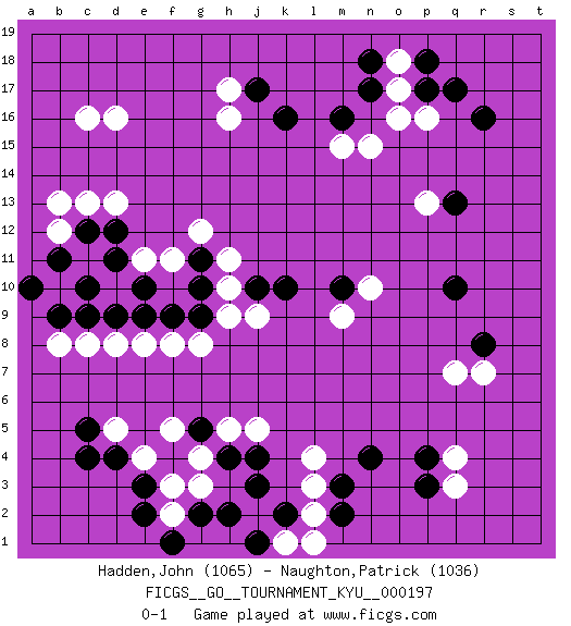 Last move : 0-1 2019 November 11 22:47:20 [Event "FICGS__GO__TOURNAMENT_KYU__000197"] [Site "FICGS"] [Date "2019.08.20"] [Round "1"] [Black "Hadden,John"] [White "Naughton,Patrick"] [Result "0-1"] [Rating 1 "1065"] [Rating 2 "1036"] 1.c4 q4 2.r16 d16 3.k16 p16 4.p17 o16 5.q10 r7 6.r8 q7 7.n4 l3 8.m3 l4 9.p4 q3 10.p3 g3 11.e3 d13 12.d11 h17 13.j17 h16 14.m16 o17 15.q17 p13 16.q13 n15 17.n17 o18 18.p18 m15 19.n18 c16 20.c12 c13 21.k10 j9 22.j10 h9 23.g10 h10 24.g9 h11 25.g5 c8 26.c9 d8 27.d9 e8 28.e9 f8 29.f9 g8 30.j3 j5 31.h4 h5 32.j4 g4 33.k2 l2 34.m2 k1 35.j1 l1 36.g2 f2 37.h2 f3 38.e2 f5 39.f1 e4 40.d4 d5 41.c5 b10 42.b9 b8 43.a10 e11 44.e10 f11 45.g11 g12 46.d12 b12 47.b11 b13 48.c10 m9 49.m10 n10 0-1 Here are the names of the openings (joseki) played in the four corners : Corner q16 : r16 p16 Komoku (Somok, Xiao~mu`) 3-4 Point. The komoku (3-4) point is the traditional corner enclosure move.. Ikken Takagakari (Hankan Nop'dakeolch'im, Yi Gaogua`jiao~, 1-Space High Approach). The 5-4 approach move has become more popular in modern times, as modern Go emphasizes speed and influence. Corner d4 : c4 g3 Komoku (Somok, Xiao~mu`) 3-4 Point. The komoku (3-4) point is the traditional corner enclosure move.. Player White won this Go (weiqi, baduk) game. Follow this game move after move (download)The simplest move is the best move. (Anonymous) Mac users swear by their computers. PC users swear at their computers. (Author unknown)