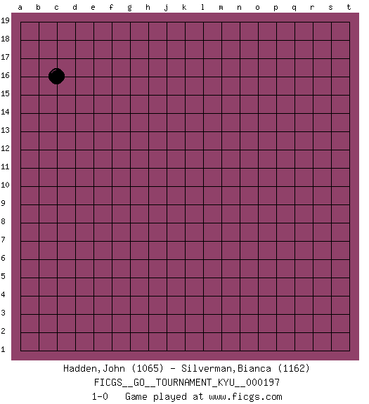 Last move : 1-0 2019 September 26 9:57:19 [Event "FICGS__GO__TOURNAMENT_KYU__000197"] [Site "FICGS"] [Date "2019.08.20"] [Round "1"] [Black "Hadden,John"] [White "Silverman,Bianca"] [Result "1-0"] [Rating 1 "1065"] [Rating 2 "1162"] 1.c16 1-0 This go game has been lost on time (started : 2019.08.20 9:10:37) Here are the names of the openings (joseki) played in the four corners : Player Black won this Go (weiqi, baduk) game. Follow this game move after move (download)If you have won four corners, resign. (Anonymous) To err is human, to shift the blame on someone else is tactical. (Mladen Jankovic)