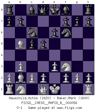 Last move : 0-1 2007 August 3 13:56:22 [Event "FICGS__CHESS__RAPID_B__000056"] [Site "FICGS"] [Date "2007.06.20"] [Round "1"] [White "Hauschild,Achim"] [Black "Baker,Mark"] [Result "0-1"] [WhiteElo "1620"] [BlackElo "1600"] 1.b3 d5 2.Bb2 c5 3.e3 Nc6 4.Nf3 Nf6 5.Bb5 e6 0-1 This chess game has been lost on time (started : 2007.06.20 12:13:33) Nimzovich-Larsen attack : Classical variation Player Black won this chess game. Follow this game move after move (download)Chess is a forcing house where the fruits of character can ripen more fully than in life. (Edward Morgan Foster) Ich könnte leicht behaupten: Ja,ja, Leonid Breschnew wollte nicht, daß ich Weltmeister werde. In der Tat war die Sache komplizierter. (Viktor Kortschnoi) El Ajedrez no es como la vida... ¡tiene reglas!. (Mark Pasternak) Assurément je connaissais par expérience le mystérieux attrait de ce jeu royal, le seul entre tous les jeux inventés par les hommes qui échappe souverainement à la tyrannie du hasard, le seul où l'on ne doive sa victoire qu'à son intelligence ou plutôt à une certaine forme d'intelligence. Mais n'est-ce pas déjà le limiter injurieusement que d'appeler les échecs un jeu ? N'est-ce pas une science, un art ou quelque chose qui, comme le cercueil de Mahomet entre ciel et terre, est suspendu entre l'un et l'autre, et qui réunit un nombre incroyable de contraires ? [...] C'est une pensée qui ne mène à rien, une mathématique qui n'établit rien, un art qui ne laisse pas d'uvre, une architecture sans matière; et il l'a prouvé néanmoins qu'il était plus durable, à sa manière, que les livres ou que tout autre monument, ce jeu unique qui appartient à tous les peuples et à tous les temps, et dont personne ne sait quel dieu en fit don à la terre pour tuer l'ennui, pour aiguiser l'esprit et stimuler l'âme. Où commence-t-il, où finit-il ? (Stefan Zweig) I think your argument is specious - I think your tie is ugly. (Gregory House to Dr. Foreman, House M.D.)