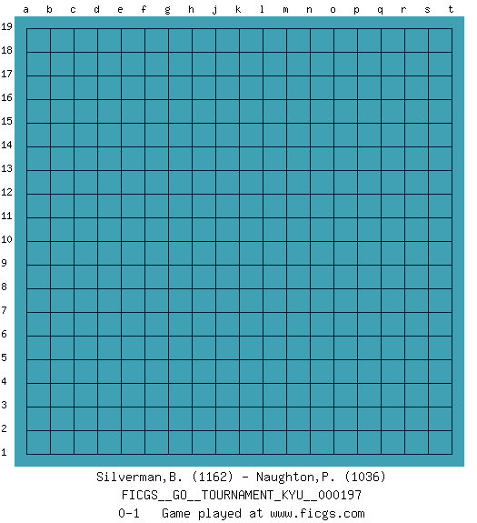 Last move : 0-1 2019 September 19 18:5:46 [Event "FICGS__GO__TOURNAMENT_KYU__000197"] [Site "FICGS"] [Date "2019.08.20"] [Round "1"] [Black "Silverman,Bianca"] [White "Naughton,Patrick"] [Result "0-1"] [Rating 1 "1162"] [Rating 2 "1036"] 0-1 This go game has been lost on time (started : 2019.08.20 9:10:37) Here are the names of the openings (joseki) played in the four corners : Player White won this Go (weiqi, baduk) game. Follow this game move after move (download)A meijin needs no joseki. (Anonymous) You cannot beat a roulette table unless you steal money from it. (Albert Einstein)