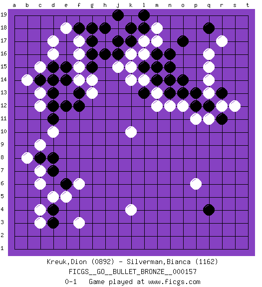 Last move : 0-1 2019 August 20 9:31:5 [Event "FICGS__GO__BULLET_BRONZE__000157"] [Site "FICGS"] [Date "2019.08.20"] [Round "1"] [Black "Kreuk,Dion"] [White "Silverman,Bianca"] [Result "0-1"] [Rating 1 "0892"] [Rating 2 "1162"] 1.d4 q16 2.q4 d16 3.o17 q14 4.q18 r17 5.k17 c6 6.e6 c3 7.d3 c4 8.d7 c7 9.d8 c9 10.c8 b8 11.c14 c12 12.e14 f17 13.g17 f16 14.g18 c15 15.g16 f15 16.f18 e18 17.g15 f14 18.f13 g14 19.d13 g13 20.f12 b14 21.d11 c13 22.d12 m17 23.m16 l16 24.n16 l17 25.l18 m18 26.l19 k16 27.j16 j15 28.j17 l14 29.m14 m13 30.l13 k14 31.n13 m12 32.l15 n14 33.m15 k15 34.o14 n12 35.o13 o12 36.p13 r12 37.p12 p11 38.q12 q11 39.r13 q13 40.r11 s12 41.d15 k10 42.d14 d5 43.h16 d17 44.e15 q15 45.h18 k4 46.j19 e5 47.n15 f6 48.k18 d10 49.e12 p6 50.n14 f3 0-1 Here are the names of the openings (joseki) played in the four corners : Corner q16 : q16 o17 Hoshi (Hwajeom, Seongjeom, Xingwei`) 4-4 Point. The star or hoshi (4-4) point, emphasizing influence at the potential expense of territory. Ikken Kakari (Hankan Keolch'im, Yi Gua`jiao~, 1-Space Low Approach). Black 2 is the standard approach move to the 4-4. Corner d4 : d4 c6 Hoshi (Hwajeom, Seongjeom, Xingwei`) 4-4 Point. The star or hoshi (4-4) point, emphasizing influence at the potential expense of territory. Ikken Kakari (Hankan Keolch'im, Yi Gua`jiao~, 1-Space Low Approach). White 2 is the standard approach move to the 4-4. Corner d16 : d16 c14 Hoshi (Hwajeom, Seongjeom, Xingwei`) 4-4 Point. The star or hoshi (4-4) point, emphasizing influence at the potential expense of territory. Ikken Kakari (Hankan Keolch'im, Yi Gua`jiao~, 1-Space Low Approach). Black 2 is the standard approach move to the 4-4. Corner q4 : q4 p6 Hoshi (Hwajeom, Seongjeom, Xingwei`) 4-4 Point. The star or hoshi (4-4) point, emphasizing influence at the potential expense of territory. Player White won this Go (weiqi, baduk) game. Follow this game move after move (download)Go is essentially a form of harmony. Go in the 21st century will have to be go of the 'harmony of the six points - the four quarters, the above and the below.' As in life we will need to view the whole rather than the part. Japanese go has focused too heavily on the local (joseki) rather than the whole for 300 years. The reason the Chinese and Koreans are overtaking the Japanese is that they are closer to achieve this whole-board view. (Go Seigen, 9p, 1994) Lottery : A tax on people who are bad at math. (Author unknown)