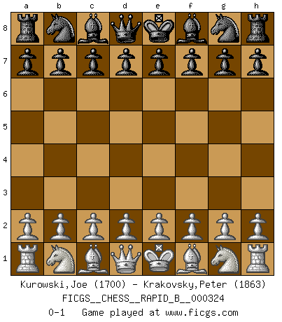Last move : 0-1 2019 September 19 18:5:46 [Event "FICGS__CHESS__RAPID_B__000324"] [Site "FICGS"] [Date "2019.08.20"] [Round "1"] [White "Kurowski,Joe"] [Black "Krakovsky,Peter"] [Result "0-1"] [WhiteElo "1700"] [BlackElo "1863"] 0-1 This chess game has been lost on time (started : 2019.08.20 14:57:18) Player Black won this chess game. Follow this game move after move (download)Personally, I rather look forward to a computer program winning the world Chess Championship. Humanity needs a lesson in humility. (Richard Dawkings) Ich würde mich als ganz normalen Jungen bezeichnen [Im Alter von 12]. (Sergej Karjakin) Coloca el contenido del tablero de Ajedrez en un sombrero, agita las piezas vigorosamente, derrámalas en el tablero desde una altura de medio metro y así obtienes el estilo de Wilhelm Steinitz. (H. E. Bird) Les Cavaliers se révèlent fort utiles dans les positions fermées. D'habitude, les Fous sont un peu plus forts que les Cavaliers dans les positions ouvertes. Qu'on le veuille ou non, il restera toujours des exceptions ! There is a great deal of difference between an eager man who wants to read a book and a tired man who wants a book to read. (G.K. Chesterton)
