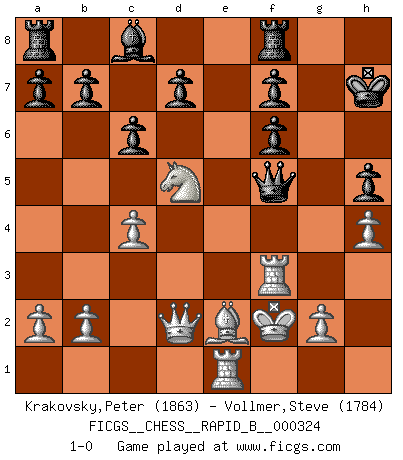 Last move : 1-0 2019 October 12 12:16:27 [Event "FICGS__CHESS__RAPID_B__000324"] [Site "FICGS"] [Date "2019.08.20"] [Round "1"] [White "Krakovsky,Peter"] [Black "Vollmer,Steve"] [Result "1-0"] [WhiteElo "1863"] [BlackElo "1784"] 1.c4 e5 2.Nc3 Nf6 3.Nf3 Nc6 4.e4 Bc5 5.Be2 O-O 6.Nxe5 Bxf2+ 7.Kxf2 Nxe5 8.d4 Ng6 9.h4 h5 10.Bg5 Qe7 11.e5 Nxe5 12.Nd5 Qd6 13.dxe5 Qxe5 14.Bxf6 gxf6 15.Qd2 c6 16.Rh3 Kh7 17.Re1 Qf5+ 18.Rf3 1-0 English Opening Kingside Castling by player Black (move 5) Player White won this chess game. Follow this game move after move (download)Even the laziest King flees wildly in the face of a double check ! (Aaron Nimzowitsch) Du musst nicht gut spielen, es reicht, wenn du besser spielst als dein Gegner. (Anonymous) El Jaque al descubierto es el bombardero del tablero. (Reuben Fine) Soyez une menace à chaque fois que vous vous asseyez pour jouer. (Ken Smith) Live, lose, and learn, by observing your opponent how to win. (Amber Steenbock)