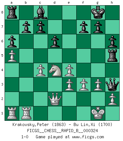 Last move : 1-0 2019 November 16 0:49:6 [Event "FICGS__CHESS__RAPID_B__000324"] [Site "FICGS"] [Date "2019.08.20"] [Round "1"] [White "Krakovsky,Peter"] [Black "Bu Lin,Xi"] [Result "1-0"] [WhiteElo "1863"] [BlackElo "1700"] 1.c4 e5 2.Nc3 Nf6 3.g3 Bb4 4.Bg2 O-O 5.Nf3 d6 6.O-O Bxc3 7.bxc3 Re8 8.d3 e4 9.Nd4 Nbd7 10.Qc2 Nc5 11.Bg5 h6 12.Bxf6 Qxf6 13.Bxe4 Nxe4 14.dxe4 Qe5 15.f3 Qc5 16.Kg2 Qxc4 17.Rfb1 Qc5 18.a4 a6 19.Qd2 Qh5 20.c4 Qh3+ 21.Kg1 Re5 22.a5 Rh5 23.e3 1-0 This chess game has been lost on time (started : 2019.08.20 14:57:18) English : Bremen, Smyslov system Kingside Castling by player Black (move 4) Kingside Castling by player White (move 6) Player White won this chess game. Follow this game move after move (download)When you absolutely don't know what to do anymore, it is time to panic. (John van der Wiel) Auf Remis zu spielen ist gewissermaßen ein Verbrechen gegen das Schachspiel. (Mikhail Nekhemyevich Tal) Muchos se han convertido en Maestros de Ajedrez, nadie se ha convertido en el Maestro del Ajedrez. (Siegbert Tarrasch) C'est une question de caractère, Beaucoup de gens perdent leur motivation très vite. D'autres, ils sont rares, peuvent la conserver très longtemps. J'aime les échecs, encore aujourd'hui je suis heureux d'analyser des parties. J'aime toujours gagner, je déteste encore perdre. Bien jouer est important pour mon intégrité intellectuelle et morale. Et puis les échecs vivent en ce moment une période historique grâce à Internet. Ils se développent dans les systèmes éducatifs à travers le monde. Ils sortent de leur ghetto, et c'est mon rôle de mener à bien cette révolution. (Gary Kasparov) Those who make the worst use of their time are the first to complain of its brevity. (Jean de la Bruyere)