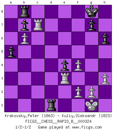 Last move : 1/2-1/2 2019 November 8 14:56:58 [Event "FICGS__CHESS__RAPID_B__000324"] [Site "FICGS"] [Date "2019.08.20"] [Round "1"] [White "Krakovsky,Peter"] [Black "Kuliy,Oleksandr"] [Result "1/2-1/2"] [WhiteElo "1863"] [BlackElo "1823"] 1.c4 e6 2.Nc3 d5 3.cxd5 exd5 4.d4 Nf6 5.Bg5 Be7 6.e3 c6 7.Bd3 O-O 8.Qc2 Nbd7 9.Nf3 Re8 10.O-O Nf8 11.h3 Be6 12.Bf4 Rc8 13.a3 Bd6 14.Bxd6 Qxd6 15.b4 Ng6 16.Qa4 a6 17.Qc2 Qe7 18.Rfc1 Bd7 19.Na4 Ne4 20.Nc5 Bf5 21.a4 Rc7 22.Rab1 h6 23.Rb2 Nh4 24.Nxh4 Qxh4 25.Nxe4 dxe4 26.Bf1 Be6 27.Qc5 Rce7 28.Qb6 Ra8 29.Bc4 Qf6 30.Rbc2 Rd7 31.Qc5 Qg6 32.Bxe6 Qxe6 33.Rb2 f5 34.b5 cxb5 35.axb5 a5 36.b6 f4 37.exf4 Qf6 38.Re2 Qxd4 39.Qxd4 Rxd4 40.Rc7 Rb8 41.Re3 Rd1+ 1/2-1/2 English Opening Kingside Castling by player Black (move 7) Kingside Castling by player White (move 10) This chess game ended in a draw. Follow this game move after move (download)War is the child of passion, passion is the child of narcissism and narcissism is the child. (...) Another game ? (Thibault de Vassal) Obwohl ich alt bin, darf mir niemand den Finger in den Mund stecken, sonst beisse ich. (Wilhelm Steinitz) Bendita sea la memoria de aquel que dio al mundo este juego inmortal. (A. G. Gardiner) Les échecs sont utiles à l'exercice de la faculté de penser et à celle de l'imagination. Car nous devons posséder une méthode élaborée pour atteindre des buts partout où nous devons conduire notre raison. (Leibnitz) A specialist learns more and more about less and less until he knows everything about nothing. (Nicholas Murray Butler)