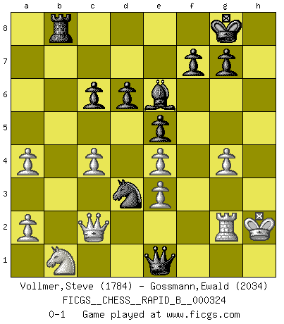 Last move : 0-1 2019 September 22 18:29:1 [Event "FICGS__CHESS__RAPID_B__000324"] [Site "FICGS"] [Date "2019.08.20"] [Round "1"] [White "Vollmer,Steve"] [Black "Gossmann,Ewald"] [Result "0-1"] [WhiteElo "1784"] [BlackElo "2034"] 1.e4 c5 2.Nf3 Nc6 3.d4 cxd4 4.Nxd4 e6 5.c4 Nf6 6.Nc3 Bb4 7.Nxc6 bxc6 8.Bd3 e5 9.O-O O-O 10.Qc2 Bc5 11.h3 d6 12.Bg5 h6 13.Be3 Bxe3 14.fxe3 Be6 15.Rad1 Nd7 16.b3 Nc5 17.Rf3 a5 18.Bf1 Qe7 19.g4 Rfd8 20.Qh2 Rab8 21.Rb1 Rb4 22.Qc2 Rdb8 23.Bd3 a4 24.bxa4 Rxb1+ 25.Nxb1 h5 26.Rg3 Qh4 27.Rg2 hxg4 28.hxg4 Qe1+ 29.Kh2 Nxd3 0-1 Sicilian defense Kingside Castling by player White (move 9) Kingside Castling by player Black (move 9) Player Black won this chess game. Follow this game move after move (download)I played Chess with him and would have beaten him sometimes only he always took back his last move, and ran the game out differently. (Mark Twain) Im Reiche der Wirklichkeit ist man nie so glücklich wie im Reiche der Gedanken. (Arthur Schopenhauer) Todo lo que importa ante el tablero de Ajedrez son buenas jugadas. (Bobby Fischer) Votre seul travail dans les ouvertures est d'obtenir un milieu de partie jouable. (Lajos Portish) A cynic is a man who knows the price of everything but the value of nothing. (Oscar Wilde)