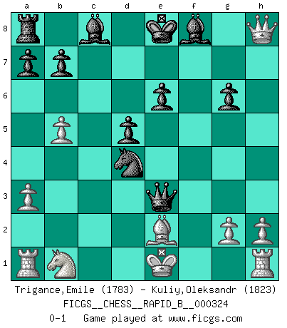Last move : 0-1 2019 September 5 8:0:30 [Event "FICGS__CHESS__RAPID_B__000324"] [Site "FICGS"] [Date "2019.08.20"] [Round "1"] [White "Trigance,Emile"] [Black "Kuliy,Oleksandr"] [Result "0-1"] [WhiteElo "1783"] [BlackElo "1823"] 1.e4 e6 2.d4 d5 3.e5 c5 4.c3 Qb6 5.Nf3 Nc6 6.a3 Nh6 7.b4 cxd4 8.cxd4 Nf5 9.Be3 f6 10.Bd3 Nxe3 11.fxe3 fxe5 12.b5 Nxd4 13.Nxe5 Nf5 14.Qh5+ g6 15.Nxg6 Qxe3+ 16.Be2 hxg6 17.Qxh8 Nd4 0-1 French : Advance variation Player Black won this chess game. Follow this game move after move (download)The Chess pieces are the block alphabet which shapes thoughts; and these thoughts, although making a visual design on the chessboard, express their beauty abstractly, like a poem. (Marcel Duchamp) In Buenos Aires ist es nicht mein vorrangiges Ziel ein starkes Turnier zu organisieren, sondern ein Turnier für Gentlemen. Ich würde nie Kamsky einladen. Ich mag keine Probleme. (Miguel Najdorf) Cada Peón es potencialmente una Reina. (James Mason) Les échecs, c'est la lutte contre l'erreur. (Johannes Zukertort) Horse racing is animated roulette. (Roger Kahn)
