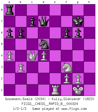 Last move : 1/2-1/2 2019 September 5 16:12:41 [Event "FICGS__CHESS__RAPID_B__000324"] [Site "FICGS"] [Date "2019.08.20"] [Round "1"] [White "Gossmann,Ewald"] [Black "Kuliy,Oleksandr"] [Result "1/2-1/2"] [WhiteElo "2034"] [BlackElo "1823"] 1.d4 d5 2.c4 e6 3.Nc3 Nf6 4.Nf3 a6 5.e3 b6 6.cxd5 exd5 7.Bd3 Bb7 8.O-O Bd6 9.Re1 O-O 10.e4 Nxe4 11.Nxe4 dxe4 12.Bxe4 Bxe4 13.Rxe4 Nc6 14.Qa4 Qd7 15.Bd2 Rfe8 16.Rxe8+ Qxe8 17.Re1 Ne7 18.Qc4 Qd7 19.Ng5 Nf5 20.Nf3 Ne7 21.Bb4 Bxb4 22.Qxb4 Nd5 23.Qc4 Qb5 24.b3 Kf8 25.Qc1 f6 26.Qc2 g6 27.a4 Qd7 28.h4 Kg7 29.h5 Qg4 30.hxg6 hxg6 31.Qc4 Qd7 32.Qe2 Qg4 33.Qc4 Qd7 1/2-1/2 QGD : 4.Nf3 Kingside Castling by player White (move 8) Kingside Castling by player Black (move 9) This chess game ended in a draw. Follow this game move after move (download)The winner of the game is the player who makes the next-to-last mistake. (Savielly Tartakover) Ich las kürzlich ein Buch von Nietzsche. Er sagte Religion verdumme nur die Menschen. Ich stimme zu. (Robert James Fischer) Vive, pierde y aprende al observar a tu oponente como ganar. (Amber Steenbock) Les Cavaliers se révèlent fort utiles dans les positions fermées. D'habitude, les Fous sont un peu plus forts que les Cavaliers dans les positions ouvertes. Qu'on le veuille ou non, il restera toujours des exceptions ! There will be no order, only chaos. (Sol Robeson in Pi by Darren Aronofsky)