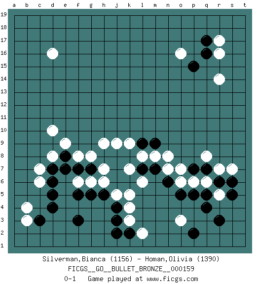 Last move : 0-1 2019 August 21 1:9:57 [Event "FICGS__GO__BULLET_BRONZE__000159"] [Site "FICGS"] [Date "2019.08.21"] [Round "1"] [Black "Silverman,Bianca"] [White "Homan,Olivia"] [Result "0-1"] [Rating 1 "1156"] [Rating 2 "1390"] 1.q4 d16 2.d4 c6 3.f3 d10 4.q16 o3 5.q7 k3 6.j4 k4 7.j3 j5 8.k2 l2 9.j2 k5 10.h5 h6 11.g5 g6 12.f5 f6 13.d5 b4 14.c3 b3 15.d6 c7 16.d7 d8 17.e7 f8 18.e8 e9 19.f7 g8 20.g7 h7 21.h8 h9 22.j8 j9 23.k8 k9 24.l9 l8 25.l7 m8 26.m9 n8 27.j6 k7 28.k6 l6 29.j7 k7 30.m7 n7 31.n6 o6 32.o5 p6 33.p5 q6 34.r6 r5 35.q5 r7 36.s6 q8 37.p7 o7 38.r3 s7 39.s5 r14 40.p2 o16 41.p15 r17 42.q17 r16 0-1 Here are the names of the openings (joseki) played in the four corners : Corner d4 : d4 c6 Hoshi (Hwajeom, Seongjeom, Xingwei`) 4-4 Point. The star or hoshi (4-4) point, emphasizing influence at the potential expense of territory. Ikken Kakari (Hankan Keolch'im, Yi Gua`jiao~, 1-Space Low Approach). White 2 is the standard approach move to the 4-4. Corner q4 : q4 o3 Hoshi (Hwajeom, Seongjeom, Xingwei`) 4-4 Point. The star or hoshi (4-4) point, emphasizing influence at the potential expense of territory. Ikken Kakari (Hankan Keolch'im, Yi Gua`jiao~, 1-Space Low Approach). White 2 is the standard approach move to the 4-4. Corner q16 : q16 r14 Hoshi (Hwajeom, Seongjeom, Xingwei`) 4-4 Point. The star or hoshi (4-4) point, emphasizing influence at the potential expense of territory. Ikken Kakari (Hankan Keolch'im, Yi Gua`jiao~, 1-Space Low Approach). White 2 is the standard approach move to the 4-4. Player White won this Go (weiqi, baduk) game. Follow this game move after move (download)Studying go is a wonderful way to develop both the creative as well as the logical abilities of children because to play it both sides of the brain are necessary. (Cho Chikun) Humor is by far the most significant activity of the human brain. (Edward De Bono)