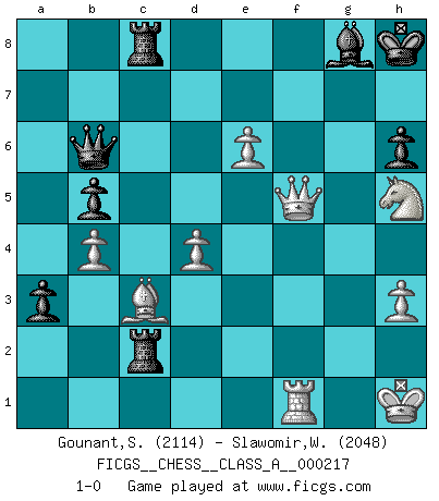Last move : 1-0 2019 October 14 22:0:30 [Event "FICGS__CHESS__CLASS_A__000217"] [Site "FICGS"] [Date "2019.08.21"] [Round "1"] [White "Gounant,Stanislas"] [Black "Slawomir,Weglicki"] [Result "1-0"] [WhiteElo "2114"] [BlackElo "2048"] 1.b3 d5 2.Bb2 Nf6 3.e3 Bf5 4.f4 e6 5.Nf3 h6 6.g3 Bc5 7.Bg2 a5 8.Nc3 O-O 9.Ne5 Bd6 10.d3 Nbd7 11.Nxd7 Qxd7 12.O-O Rfd8 13.Qe2 c6 14.a4 Bg6 15.e4 Kh8 16.Kh1 Bc5 17.e5 Ng8 18.Nd1 Ne7 19.g4 d4 20.Nf2 Bb4 21.Ne4 Nd5 22.Ng3 Ne3 23.Rf2 Be7 24.Rg1 Nxg2 25.R1xg2 Bh7 26.g5 Rg8 27.gxh6 gxh6 28.Qh5 b5 29.f5 exf5 30.axb5 cxb5 31.Ne2 Bc5 32.Nf4 Bf8 33.c3 dxc3 34.Bxc3 Qc6 35.Bb2 Bg7 36.Qxf7 a4 37.Rf1 Rae8 38.Kg1 Rc8 39.b4 Qb6+ 40.Kh1 a3 41.Ba1 Qe3 42.R2g1 Qb6 43.Qd5 Rc2 44.h3 Rd8 45.Qf3 Ra2 46.d4 Bg8 47.Bc3 Rc2 48.Rxg7 Kxg7 49.e6 Rc8 50.Nh5+ Kh8 51.Qxf5 1-0 Nimzovich-Larsen attack : Classical variation Kingside Castling by player Black (move 8) Kingside Castling by player White (move 12) Player White won this chess game. Follow this game move after move (download)Every Chess master was once a beginner. (Chernev) Mein erstes Ziel war nicht, die Partie zu gewinnen, sondern eine Figur zu opfern. -- der junge (Wilhelm Steinitz) Fischer era un maestro de claridad y un Rey del posicionamiento astuto. Sus oponentes podían ver hacia donde se dirigía pero eran impotentes para detenerlo. (Bruce Pandolfini) Votre seul travail dans les ouvertures est d'obtenir un milieu de partie jouable. (Lajos Portish) Some people are so afraid to die that they never begin to live. (Henry Van Dyke)