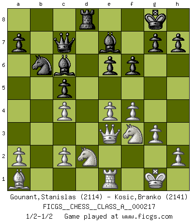 Last move : 1/2-1/2 2019 October 24 3:6:32 [Event "FICGS__CHESS__CLASS_A__000217"] [Site "FICGS"] [Date "2019.08.21"] [Round "1"] [White "Gounant,Stanislas"] [Black "Kosic,Branko"] [Result "1/2-1/2"] [WhiteElo "2114"] [BlackElo "2141"] 1.b3 c5 2.Bb2 d5 3.e3 Nf6 4.Nf3 Nc6 5.Bb5 e6 6.Ne5 Qc7 7.O-O Be7 8.Bxc6+ bxc6 9.f4 O-O 10.d3 Ne8 11.Nd2 f6 12.Nef3 Nd6 13.e4 c4 14.bxc4 Rb8 15.Bc3 c5 16.Rb1 Rxb1 17.Qxb1 dxe4 18.dxe4 Ba6 19.Qb3 Rb8 20.Qa4 Bb7 21.Re1 Bc6 22.Qa3 Nc8 23.g3 Nb6 24.Ba1 Rd8 25.Qe3 1/2-1/2 Nimzovich-Larsen attack : English variation Kingside Castling by player White (move 7) Kingside Castling by player Black (move 9) This chess game ended in a draw. Follow this game move after move (download)I'm not a materialistic person, in that, I don't suffer the lack or loss of money. The absence of worldly goods I don't look back on. For Chess is a way I can be as materialistic as I want without having to sell my soul. (Jamie Walter Adams) Wenn ich einen Club besuche, sind die Spieler stumm vor Staunen. (José Raúl Capablanca) Combinaciones deslumbrantes son para la mayoría, mover madera es para los pocos. (Georg Kieninger) Le temps de noter son nom sur la feuille de partie, j'étais déjà en zeitnot ! D'un modeste amateur apparié lors de la première ronde d'un open contre le grand-maître Azmaïparashvili. I know the human being and fish can coexist peacefully. (George W. Bush, Saginaw sept. 29, 2000)