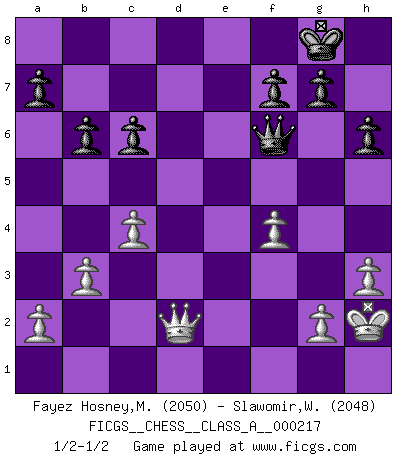 Last move : 1/2-1/2 2019 October 12 19:11:33 [Event "FICGS__CHESS__CLASS_A__000217"] [Site "FICGS"] [Date "2019.08.21"] [Round "1"] [White "Fayez Hosney,Mohammed"] [Black "Slawomir,Weglicki"] [Result "1/2-1/2"] [WhiteElo "2050"] [BlackElo "2048"] 1.f4 d5 2.Nf3 Bg4 3.e3 Nd7 4.h3 Bxf3 5.Qxf3 c6 6.b3 e5 7.Bb2 Bd6 8.c4 Ngf6 9.cxd5 Nxd5 10.Bc4 N5f6 11.O-O O-O 12.Nc3 exf4 13.exf4 Nb6 14.Kh2 Re8 15.d3 Bc5 16.Rae1 Bd4 17.Rxe8+ Qxe8 18.Rb1 Qd8 19.Ne4 Bxb2 20.Rxb2 Qd4 21.Re2 h6 22.Nxf6+ Qxf6 23.Qe4 Nxc4 24.dxc4 Rd8 25.Qe3 b6 26.Rd2 Rxd2 27.Qxd2 1/2-1/2 Bird's Opening Kingside Castling by player White (move 11) Kingside Castling by player Black (move 11) This chess game ended in a draw. Follow this game move after move (download)Discovered check is the dive bomber of the Chessboard. (Reuben Fine) Ich habe die besten Aussichten, den ersten Preis zu gewinnen - denn jeder muss gegen Steinitz spielen, nur ich nicht! (Wilhelm Steinitz) Yo tuve un dolor de muelas en la primer partida. En el segundo juego, tuve un dolor de cabeza. En el tercero, tuve un ataque de reumatísmo. En la cuarta partida, no me sentía muy bien. ¿Y en el quinto juego? Bueno, ¿que acaso uno tiene que ganar todos los juegos?. (Siegbert Tarrasch) Toutes choses étant égales, c'est la conviction qui gagne. Alliée à une volonté de vaincre, elle sert de détonateur, suscite des idées, disperse les doutes et aide à penser clairement. (Robert Fischer) Good luck. You're gonna need it. (Han Solo in Star Wars ep.6)