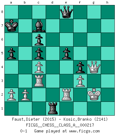 Last move : 0-1 2020 February 21 15:51:30 [Event "FICGS__CHESS__CLASS_A__000217"] [Site "FICGS"] [Date "2019.08.21"] [Round "1"] [White "Faust,Dieter"] [Black "Kosic,Branko"] [Result "0-1"] [WhiteElo "2015"] [BlackElo "2141"] 1.e4 c5 2.Nf3 Nc6 3.Bb5 e6 4.Bxc6 bxc6 5.d3 Ne7 6.h4 h5 7.e5 f6 8.Na3 fxe5 9.Nxe5 d6 10.Nf3 g6 11.Bg5 Bg7 12.Nc4 Qc7 13.Bxe7 Qxe7 14.Qd2 e5 15.O-O Bg4 16.Ng5 O-O 17.Rae1 Qd7 18.Qe3 Rae8 19.Nd2 Bf6 20.Nde4 Bd8 21.f3 Bf5 22.c4 Qe7 23.Rf2 Bc8 24.Nc3 Kg7 25.Rfe2 Qc7 26.Rc1 Be7 27.Rd1 Rf5 28.Rb1 Qd8 29.Nce4 Qc7 30.Rc1 a5 31.Qf2 Qb6 32.Rc3 Bd7 33.Rb3 Qa7 34.Qe1 R5f8 35.Qg3 Bf5 36.Ra3 d5 37.Nd2 Qd7 38.Nf1 Bd8 39.Ne3 Be6 40.Ra4 Bc7 41.Qe1 Qd6 42.Nf1 Bf5 43.Ra3 Bd8 44.Rc3 Bd7 45.Ra3 Bc8 46.Rc3 Qc7 47.Ra3 Kg8 48.Rc3 Re7 49.Ra3 Qd6 50.Rc3 Rf4 51.Ra3 Bf5 52.Ne3 Rd4 53.Nxf5 gxf5 54.Qg3 Kf8 55.Qh3 Qf6 56.Rc3 Ke8 57.Kh2 dxc4 58.dxc4 Bc7 59.g3 Kd8 60.Qf1 Rg7 61.Qe1 f4 62.Kg2 Kc8 63.Qh1 Kb7 64.Qh3 Rxg5 65.hxg5 Qxg5 66.Qh4 Qg6 67.g4 hxg4 68.Qxg4 Qh7 69.Rb3+ Ka7 70.Qh3 Qg6+ 71.Qg4 Qe8 72.Rc3 Rd1 0-1 Sicilian : Nimzovich-Rossolimo attack (without ...d6) Kingside Castling by player White (move 15) Kingside Castling by player Black (move 16) Player Black won this chess game. Follow this game move after move (download)When your house is on fire, you can't be bothered with the neighbors. Or, as we say in Chess, if your King is under attack you don't worry about losing a Pawn on the Queen's side. (Gary Kasparov) Es macht mich traurig, wenn ich sehe, dass Golfprofis mehr verdienen als Schachsportler. Obwohl ich davon überzeugt bin, dass wir Schachspieler viel härter trainieren müssen als die Golfer. (Alexandra Kosteniuk) Un mal día en el Ajedrez, es mejor que cualquier buen día en el trabajo. (Anonymous) Le joueur d'Echecs qui veut atteindre le top est obligé de développer son propre credo créatif. Alexeï Stepanovicth Souétine. Il est facile d'écrire des livres ! Ce qui est difficile, c'est de jouer ! (Alexeï Stepanovicth Souétine) It's not the size of the dog in the fight, it's the size of the fight in the dog. (Mark Twain)